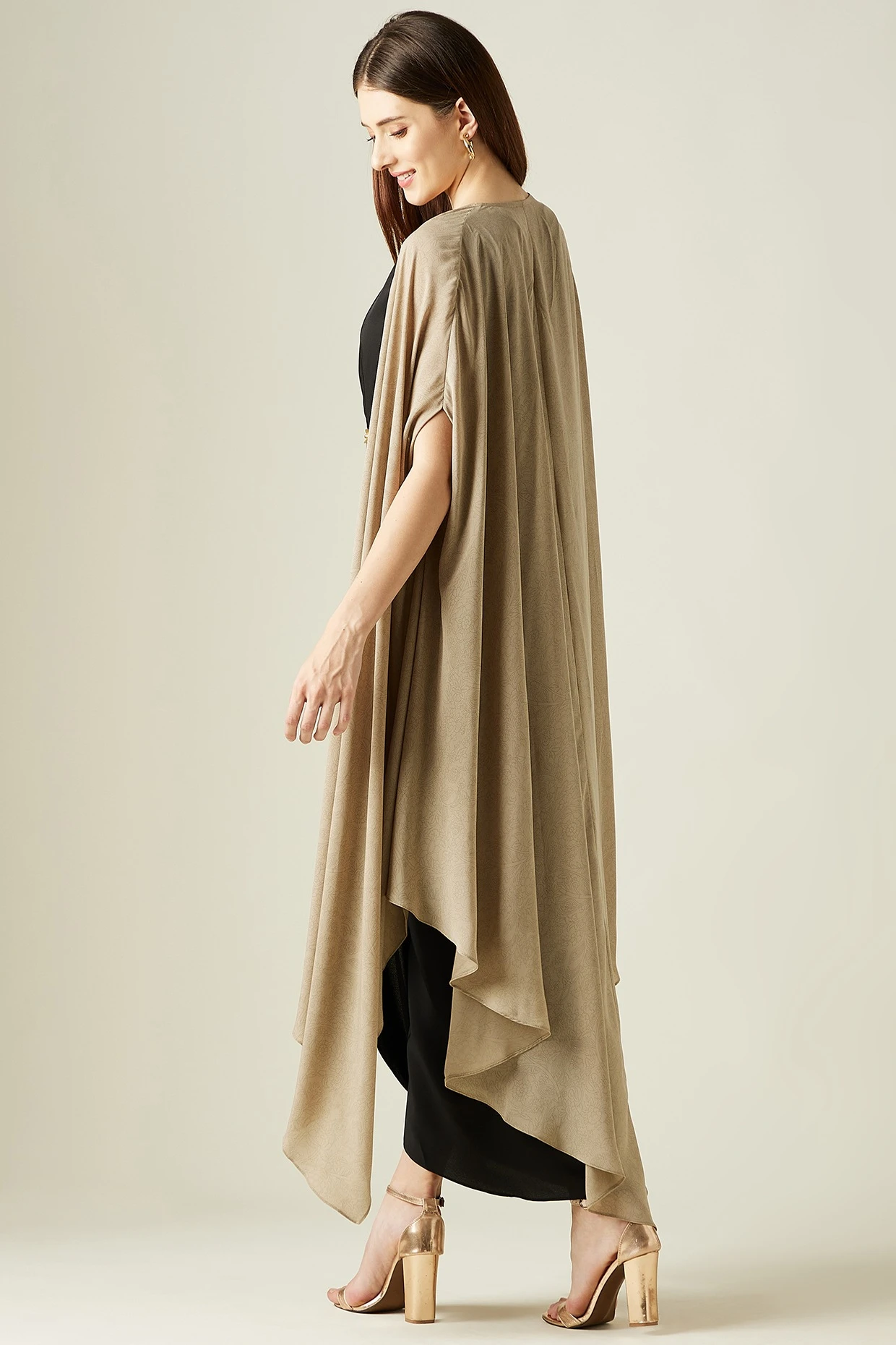 Featuring a black draped dress in moss crepe base. It is paired with a contrasting cape and a gold metallic belt.