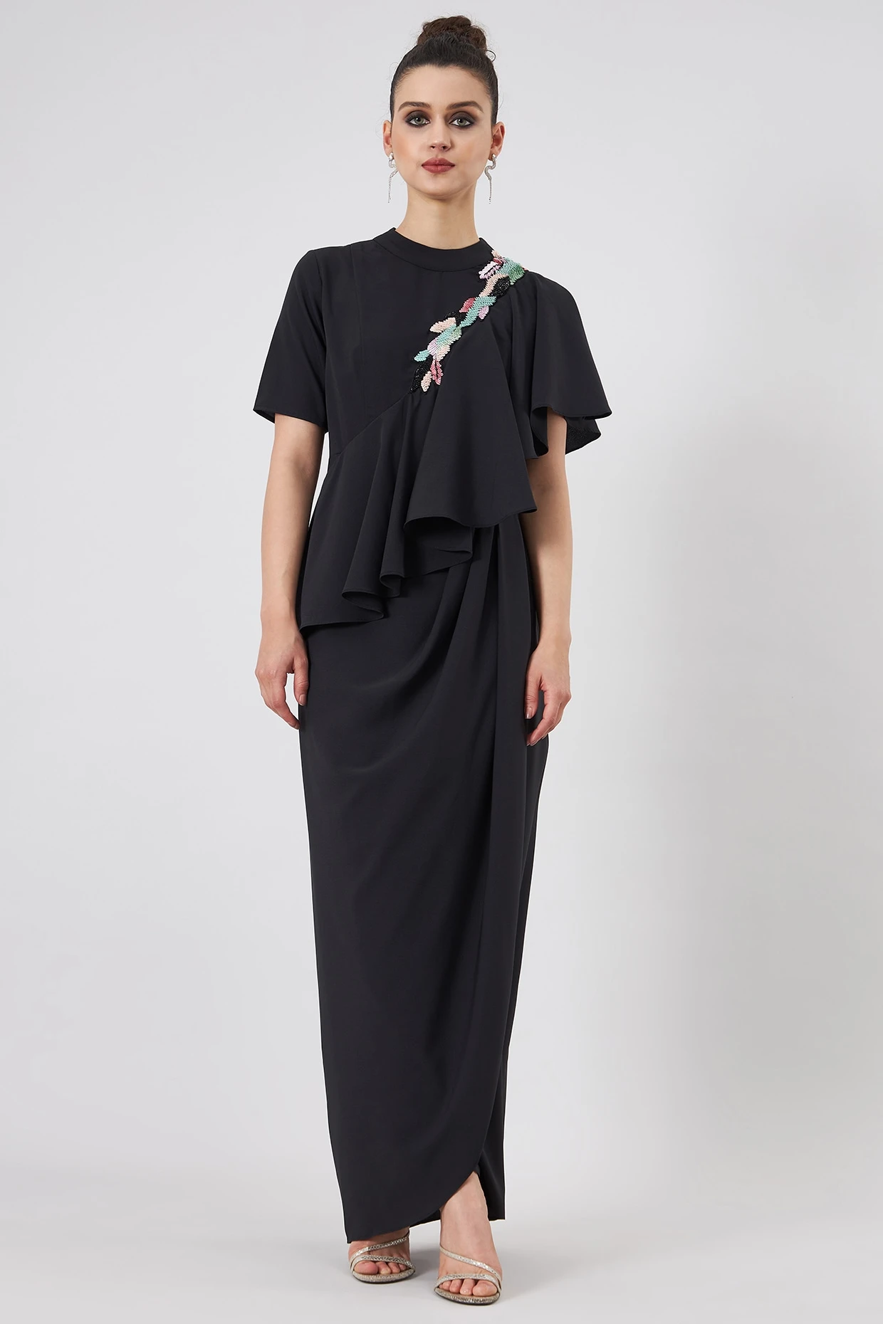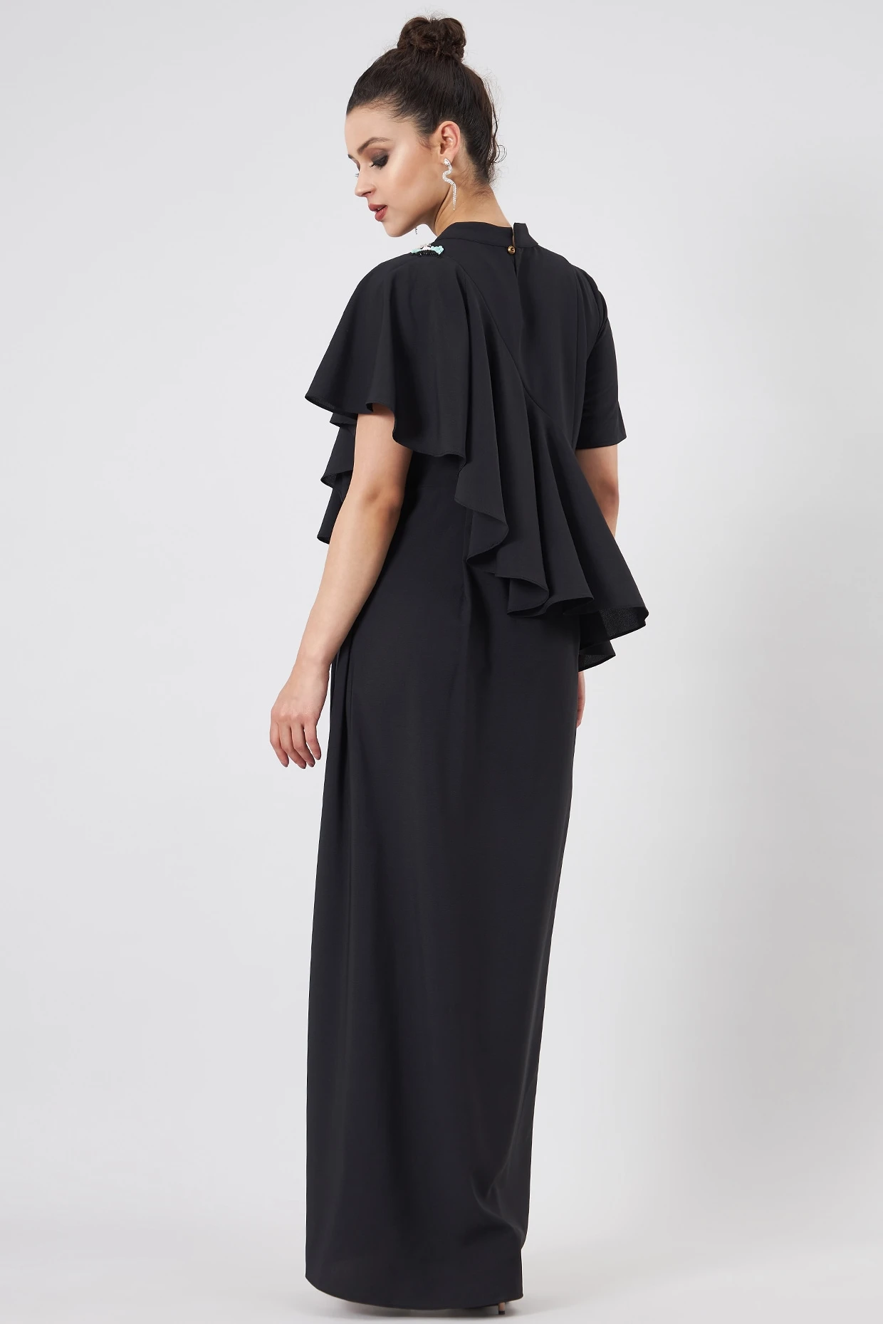 Featuring a black cape dress in moss crepe base with sequins embellishment.