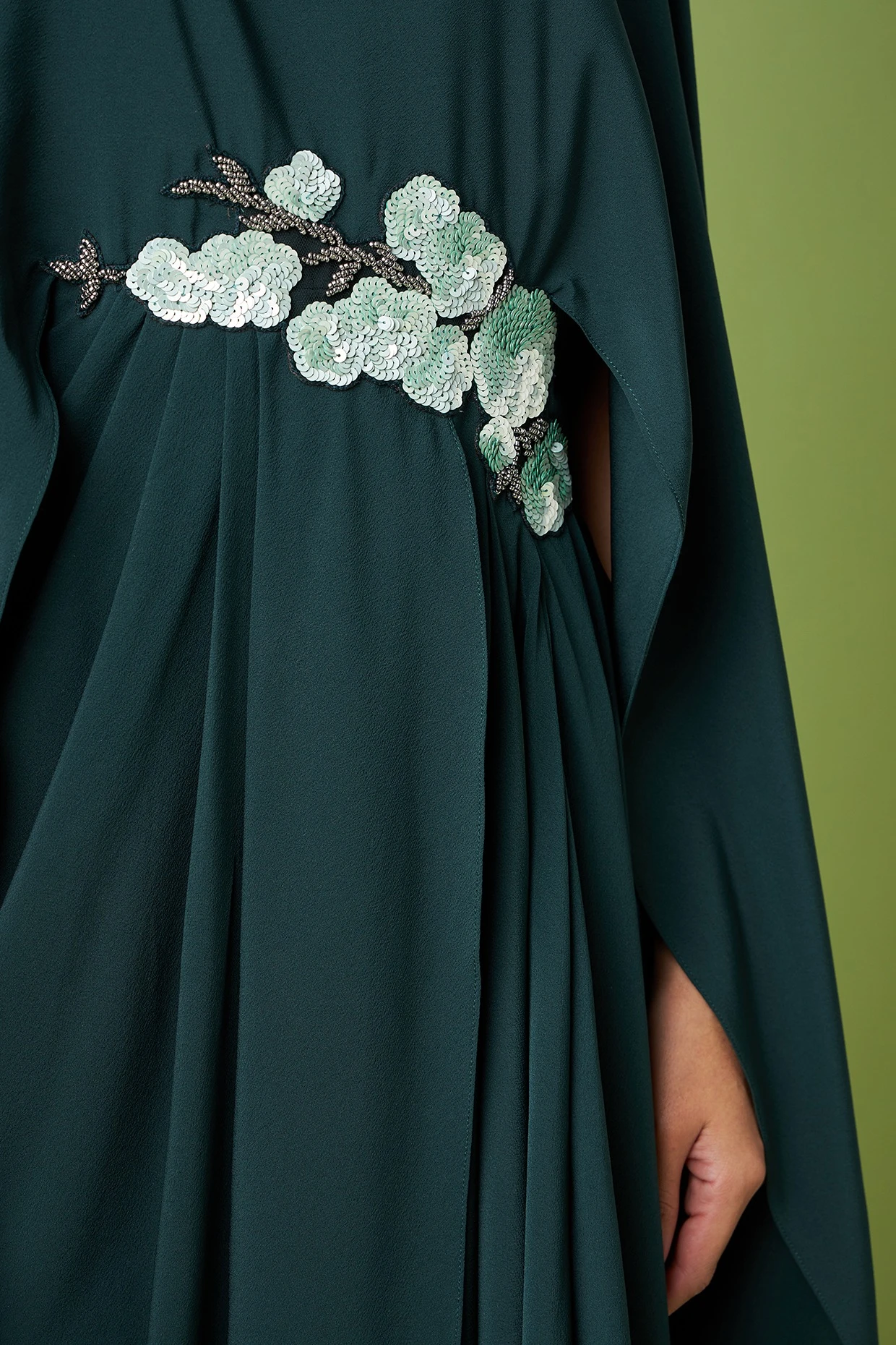 Featuring a bottle green draped dress in moss crepe with floral applique details.