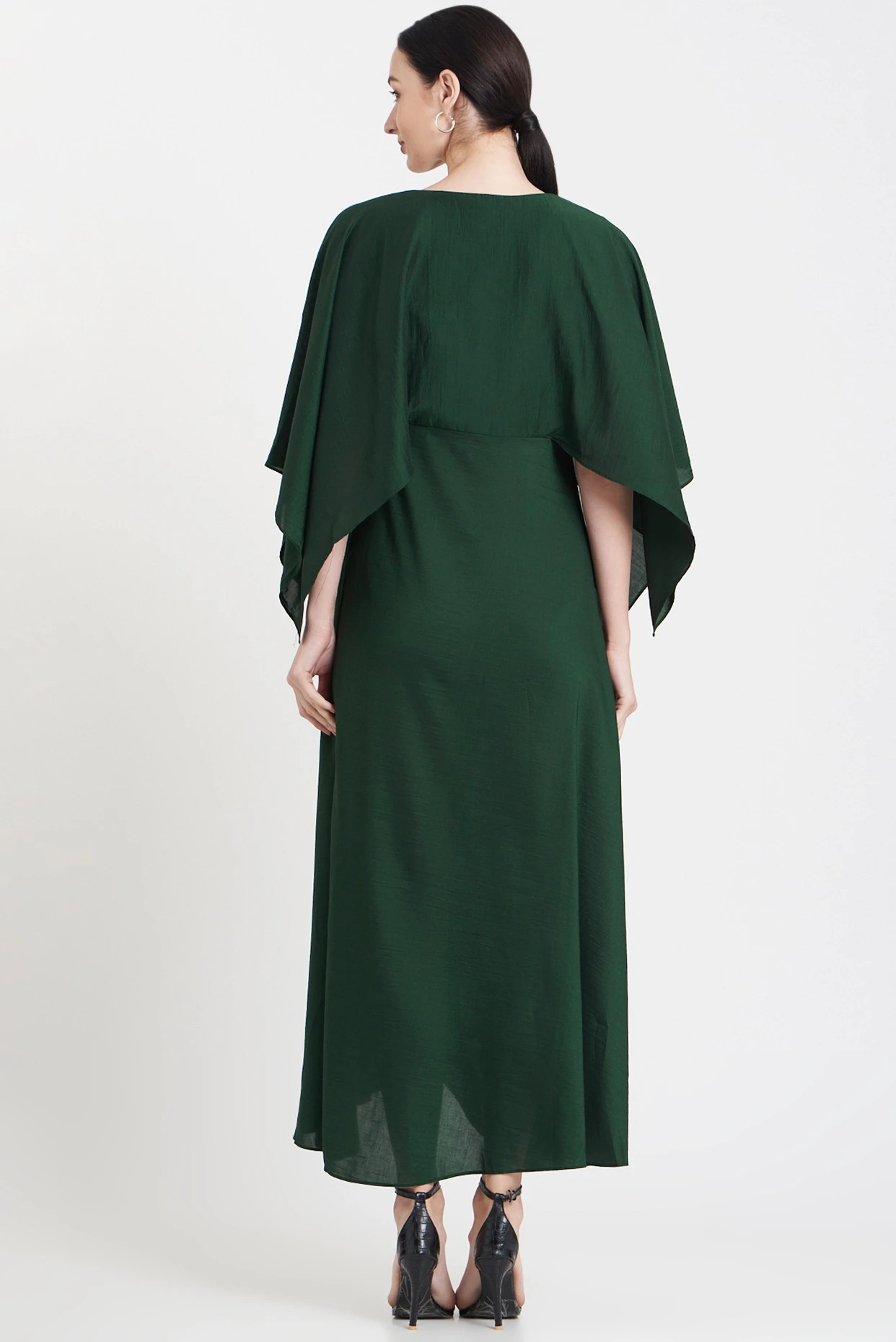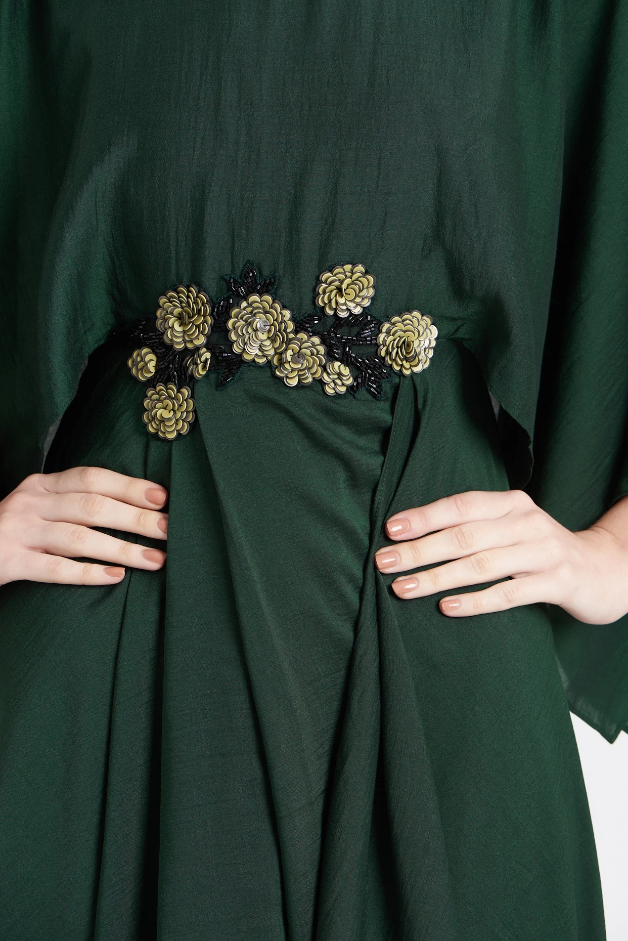 Featuring an emerald green draped maxi dress in moss crepe base with embroidery.