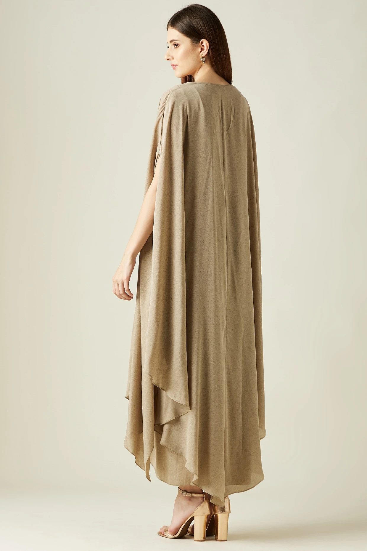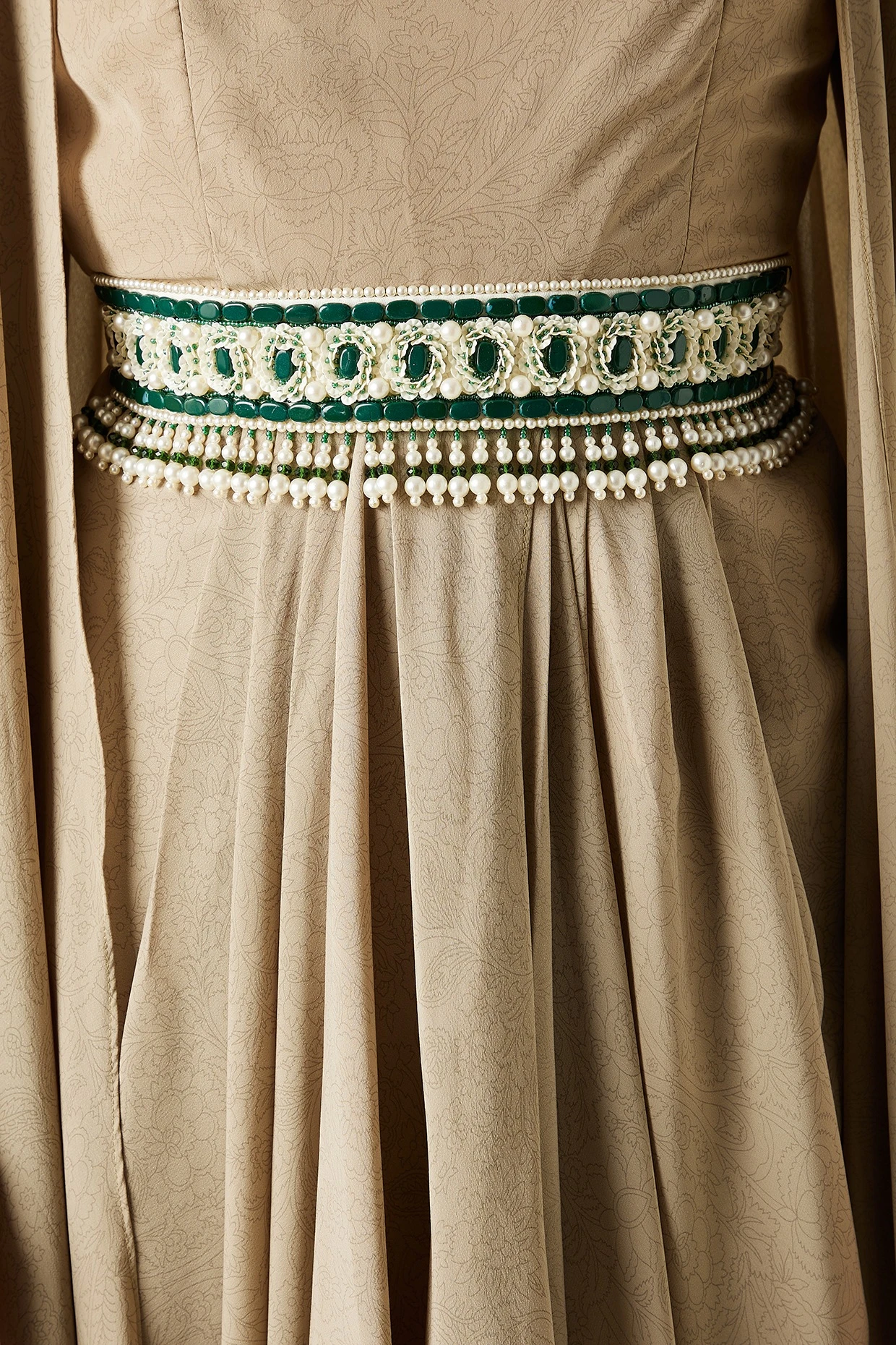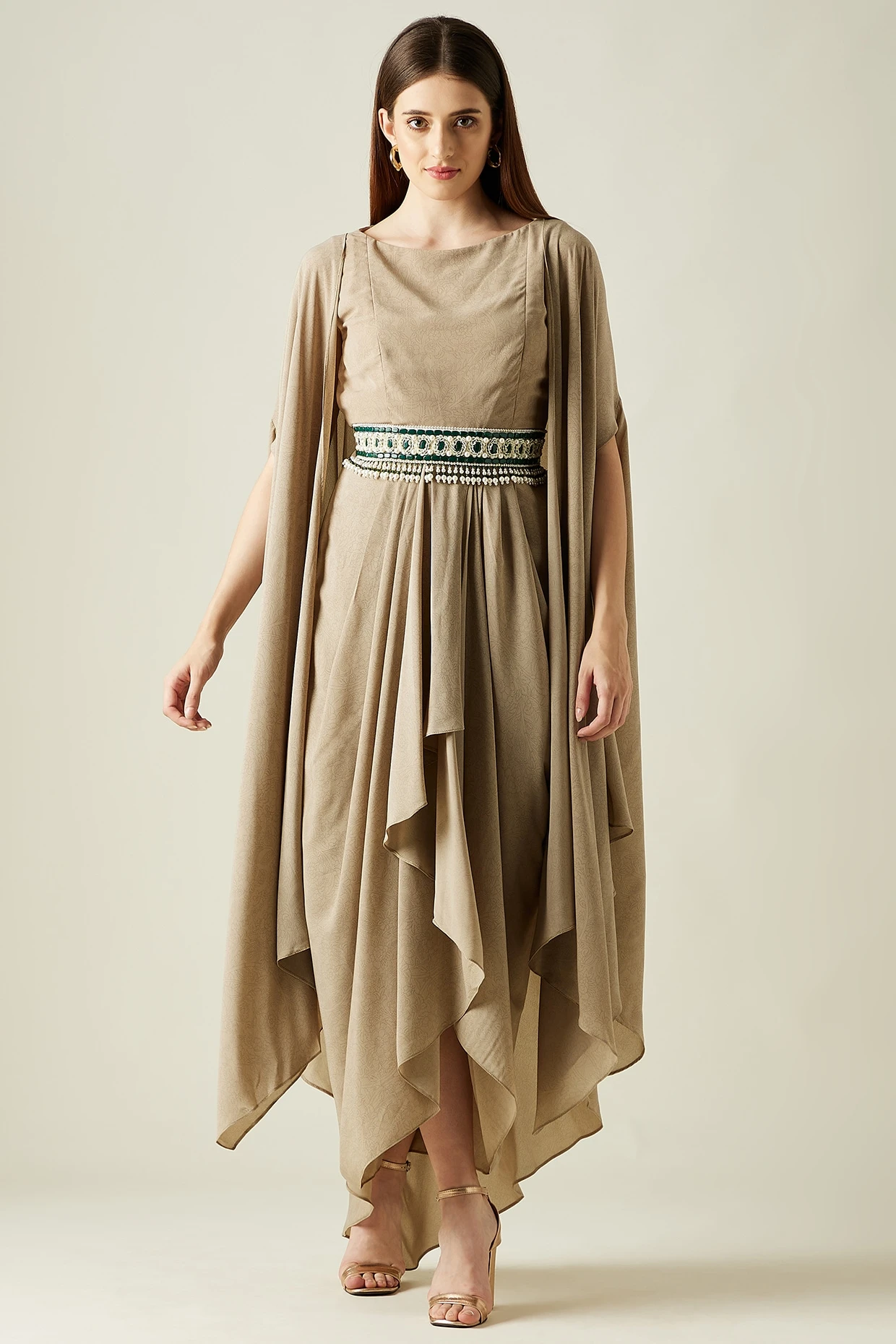 Featuring a fawn draped dress in moss crepe base. It is paired with a matching cape and a belt having emerald stone.