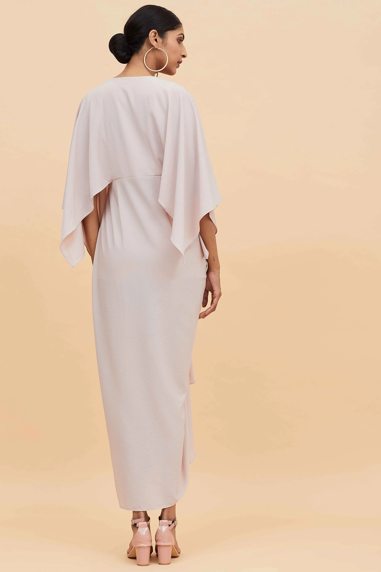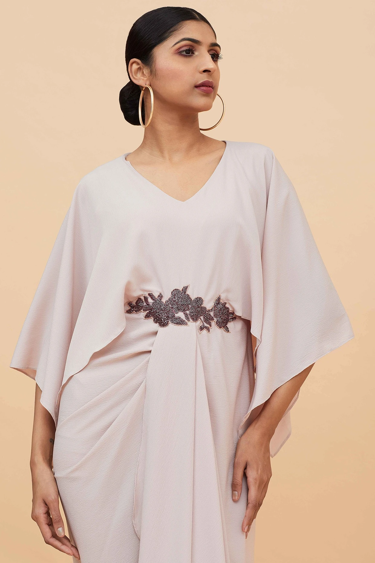 Featuring a mauve draped dress in moss crepe base.