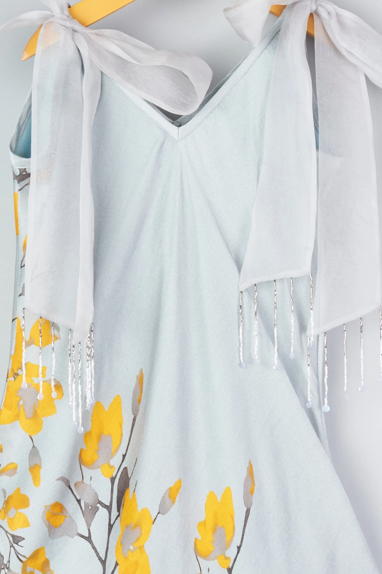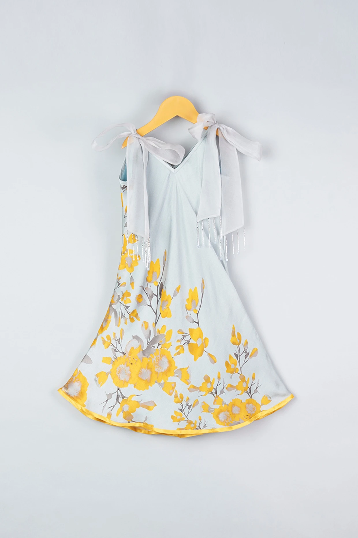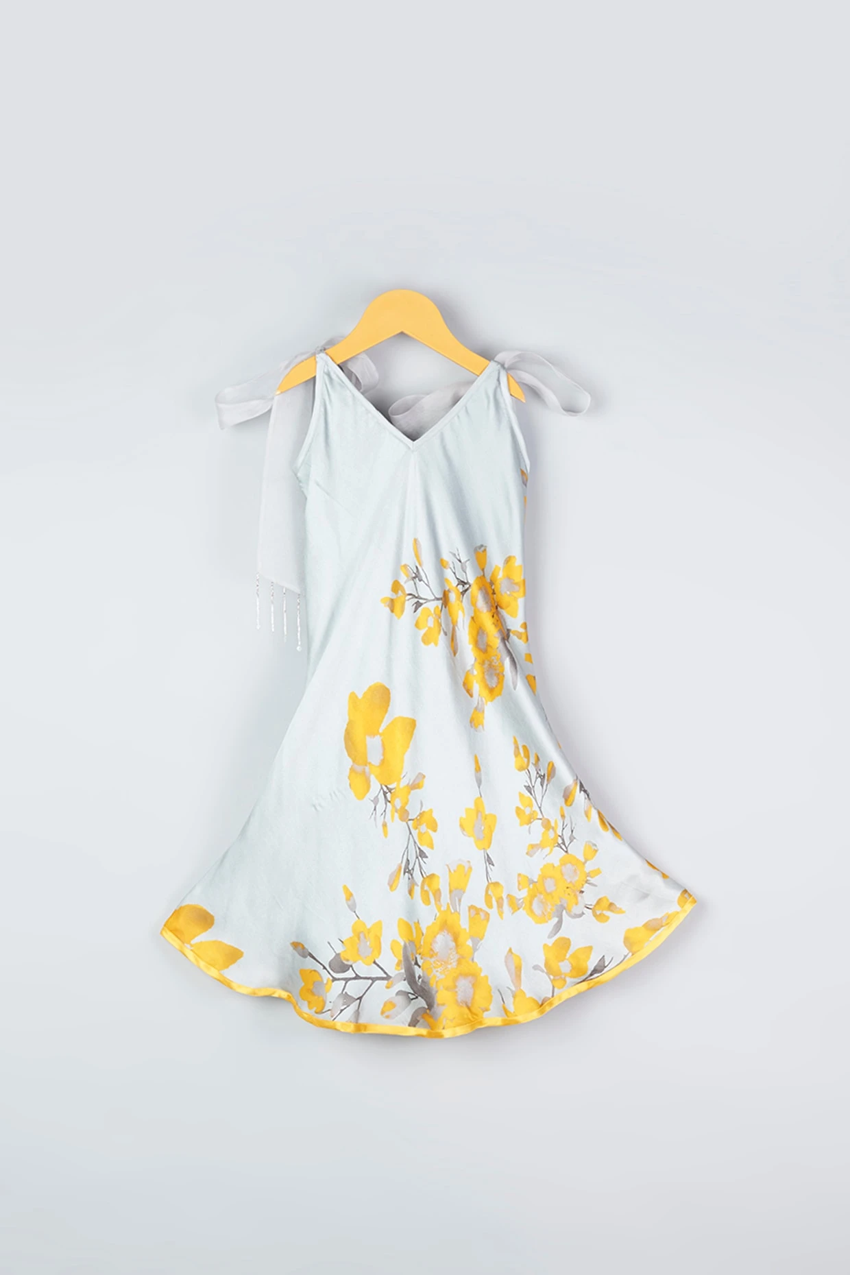 Featuring a grey dress in modal satin base with floral print and organza tie-ups.