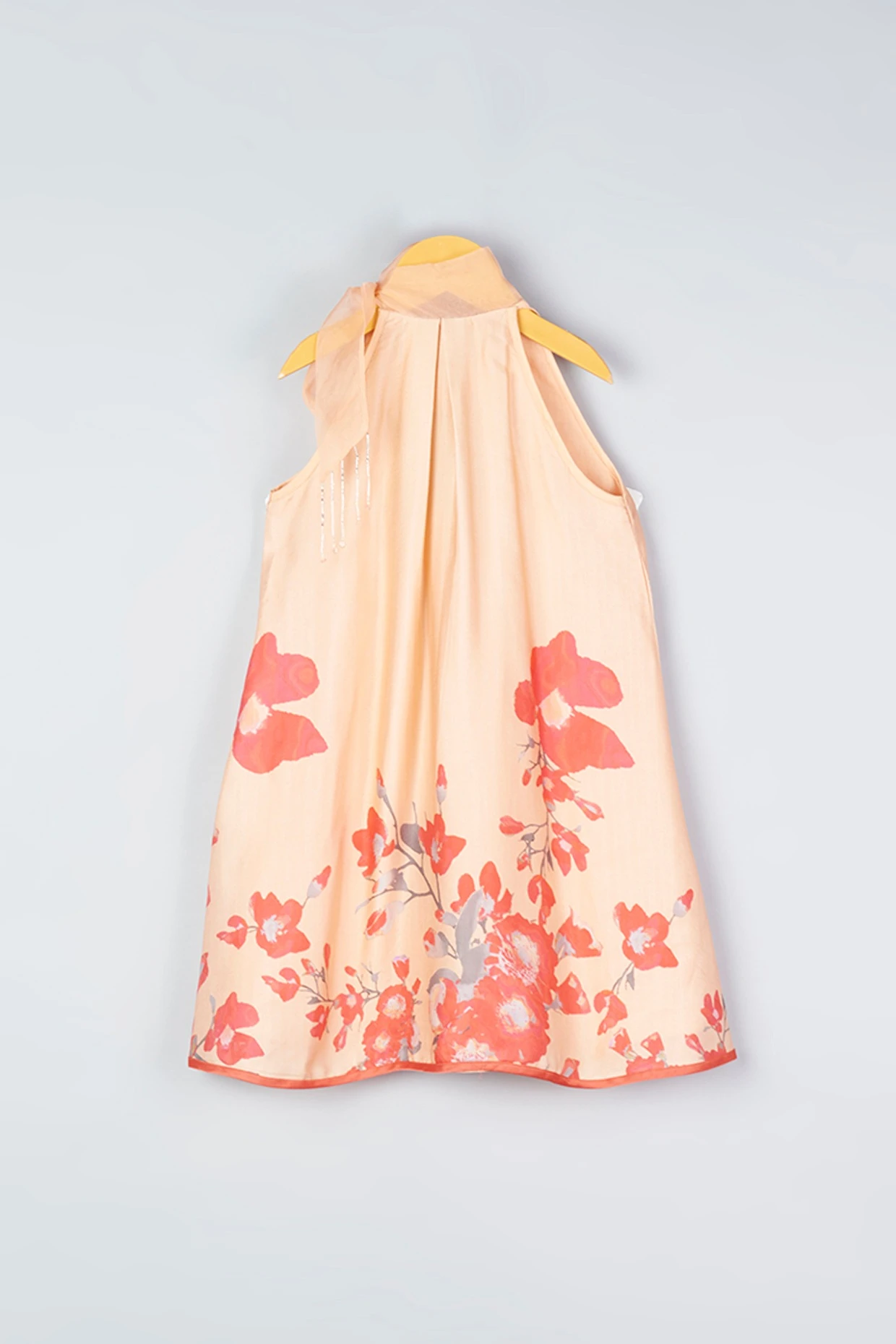 Featuring a peach dress in modal satin base with floral print and organza tie-ups.