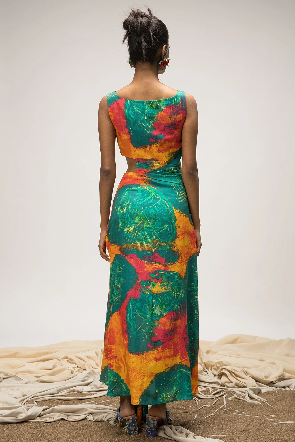 Featuring a multi-colored asymmetrical dress in bemberg pashmina twill base with a boat neckline, front ruffles, side slit, pleats and waist cut out.