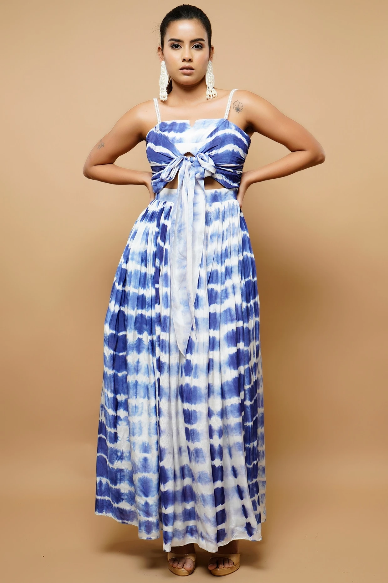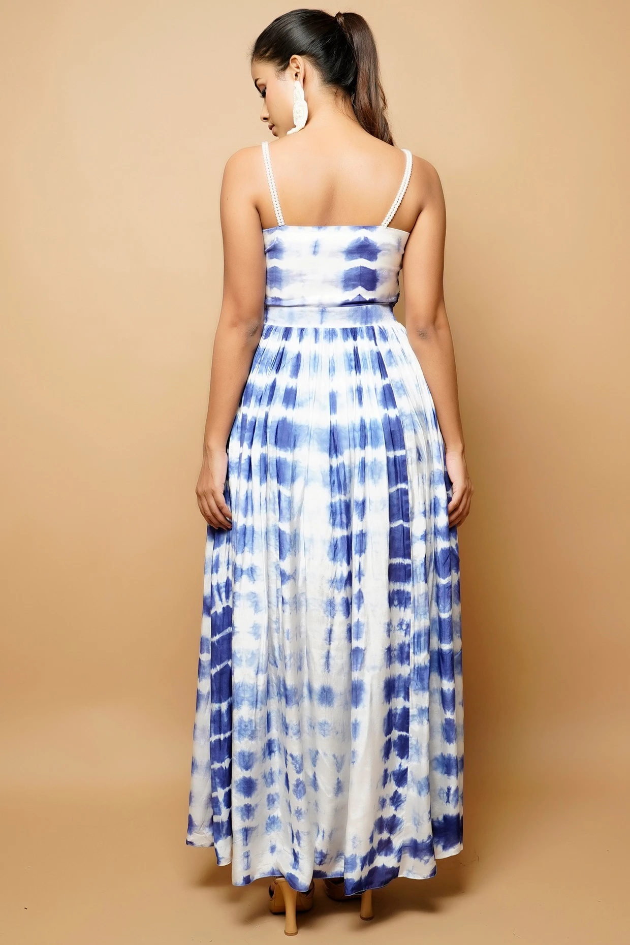 Featuring a blue and white overlapped dress in cotton silk base with tie-dye print, handmade pearl strap and slit.