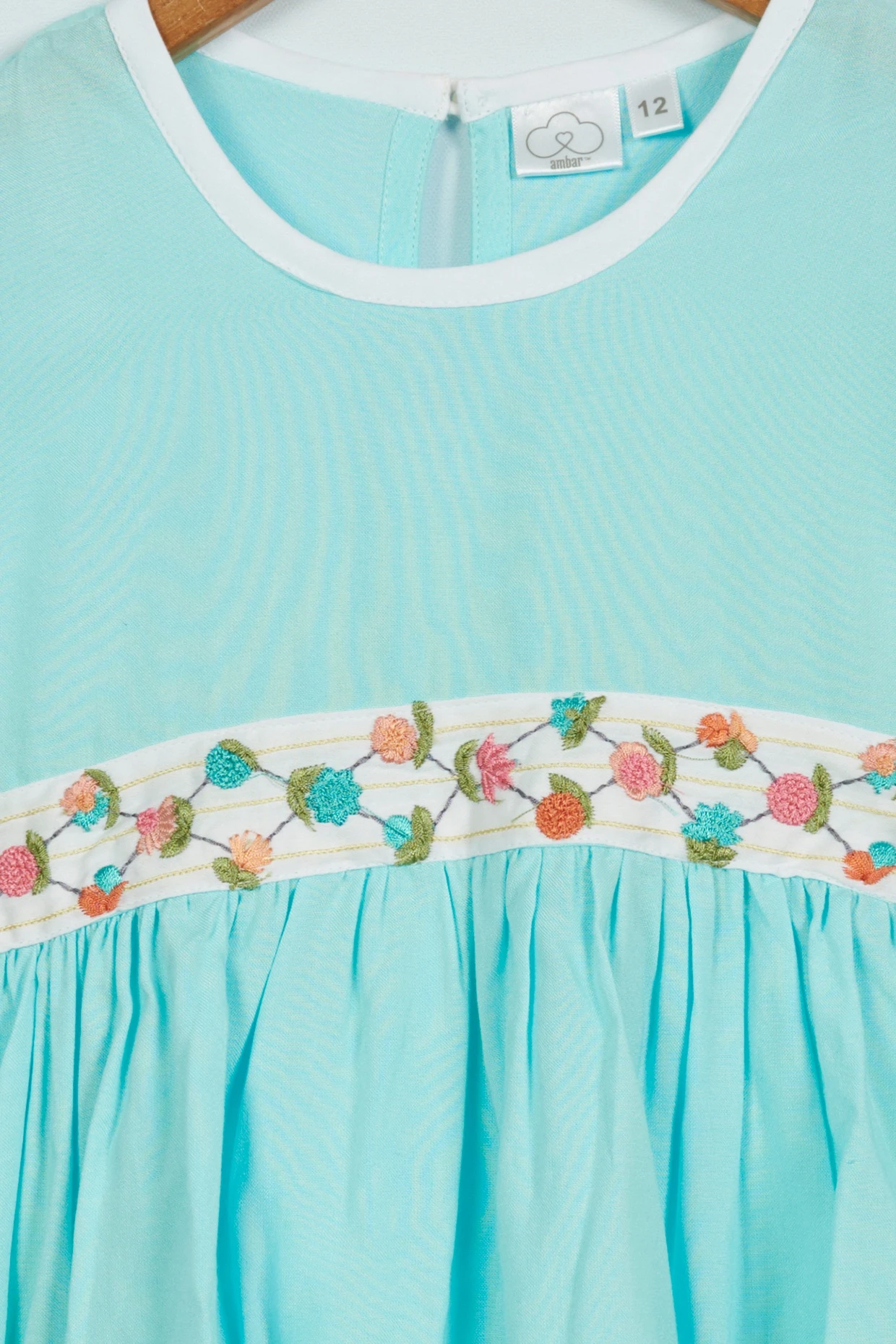 Featuring a blue flared dress in rayon and cotton base with cap sleeves, a bow, and an attached floral machine thread embroidered belt.