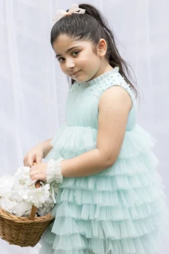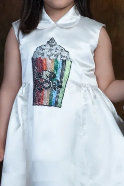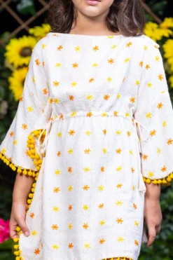 Featuring a multi-colored dress in mulmul and cotton base with floral print and cap sleeves.