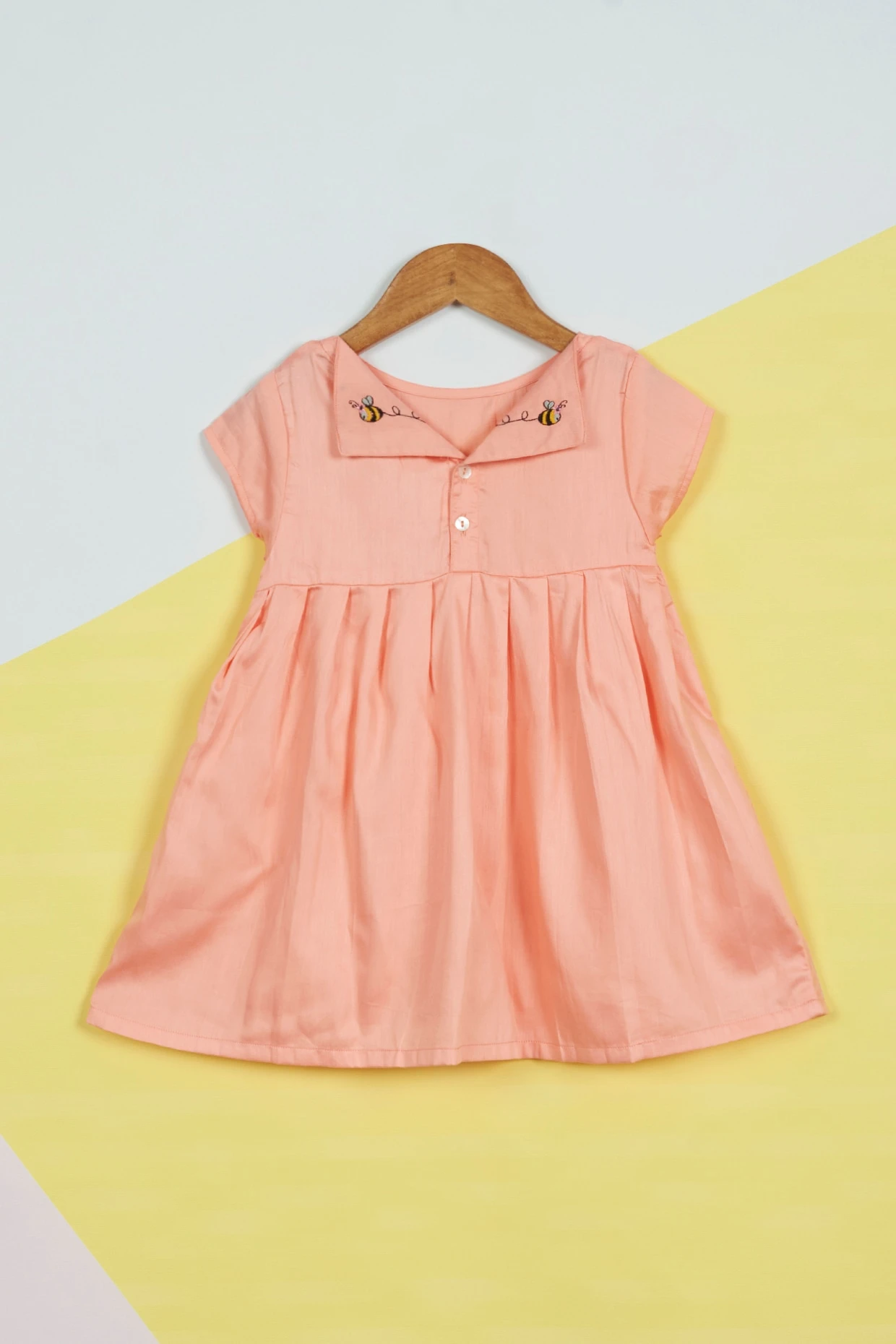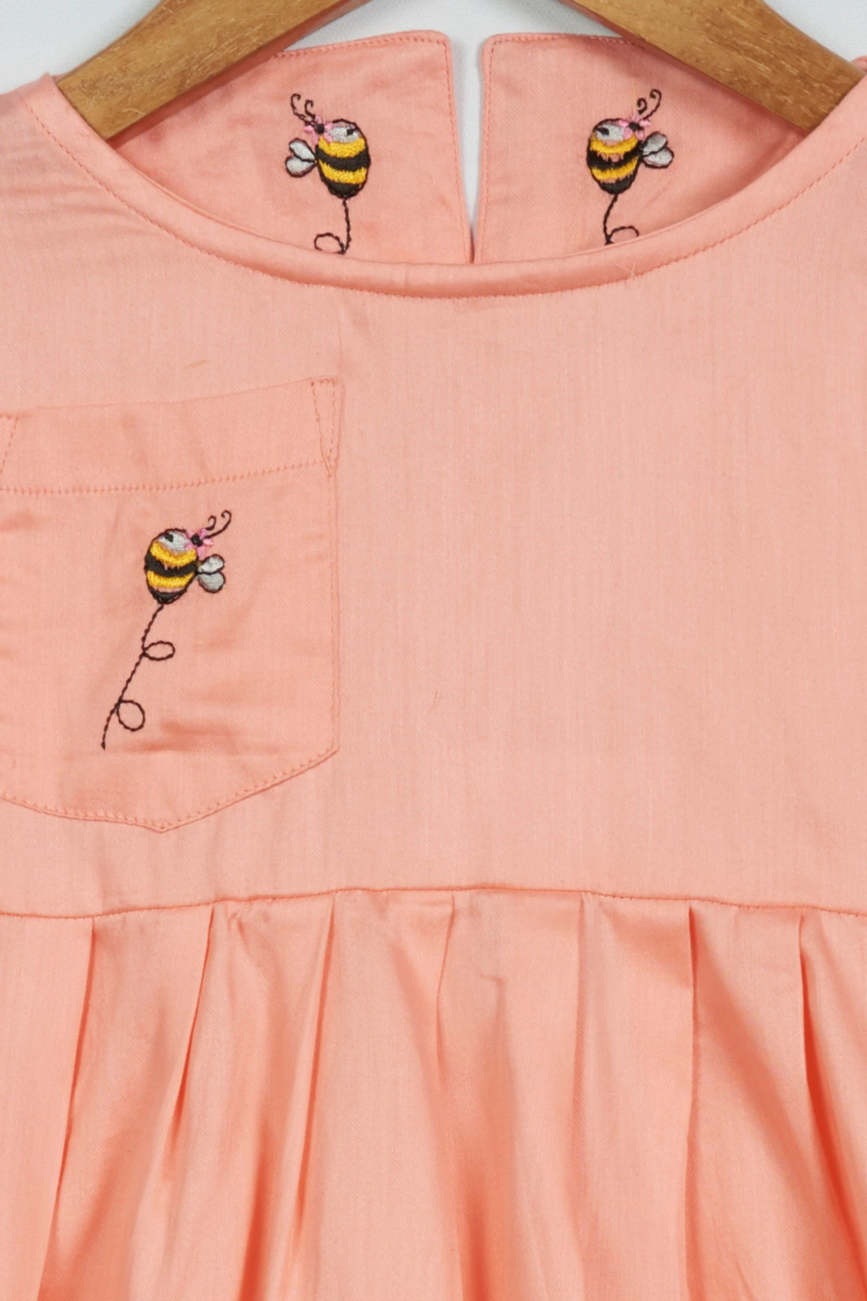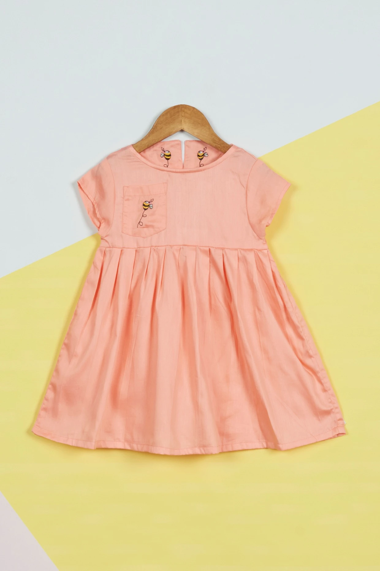 Featuring a pink dress in cotton satin and cotton base with cap sleeves, pleats, and machine thread embroidery.