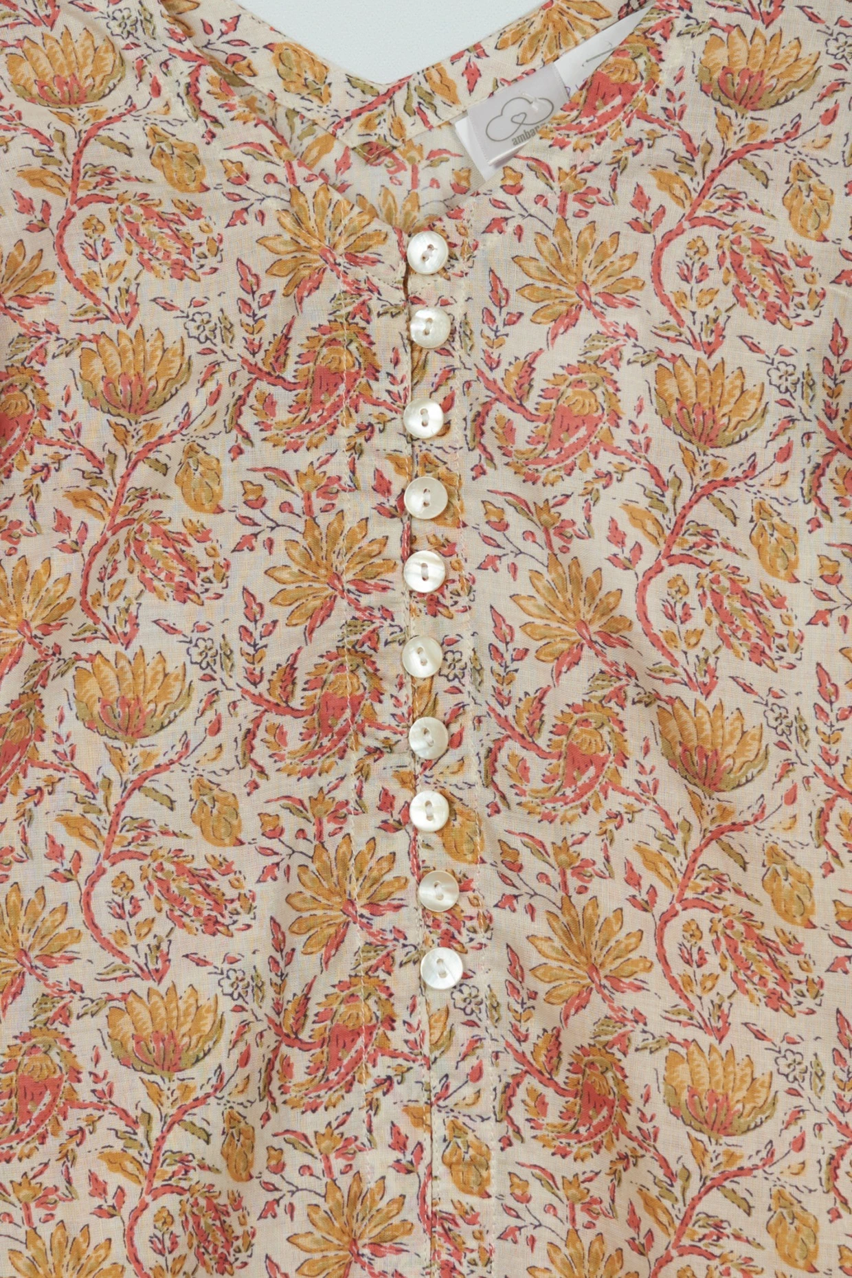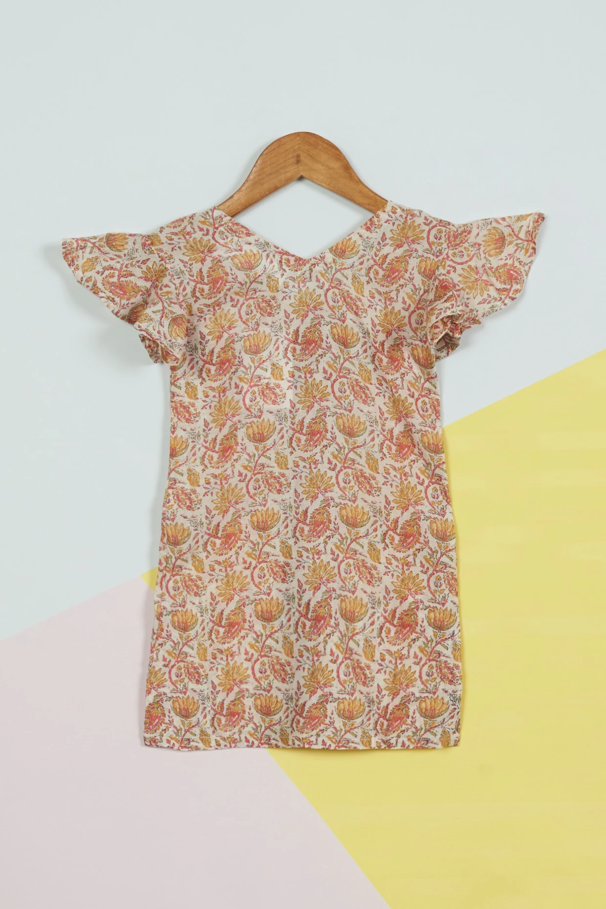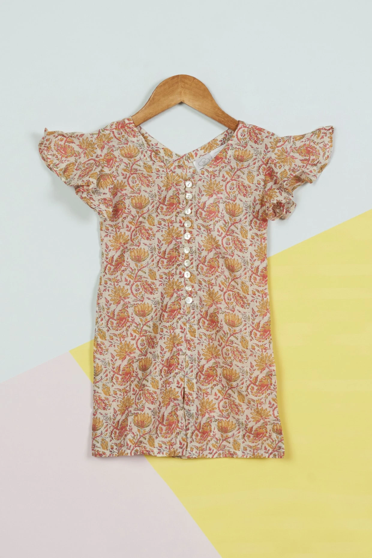 Featuring a pink dress in mulmul and cotton base with floral print, flared cap sleeves and buttons.