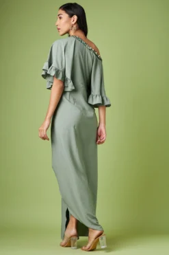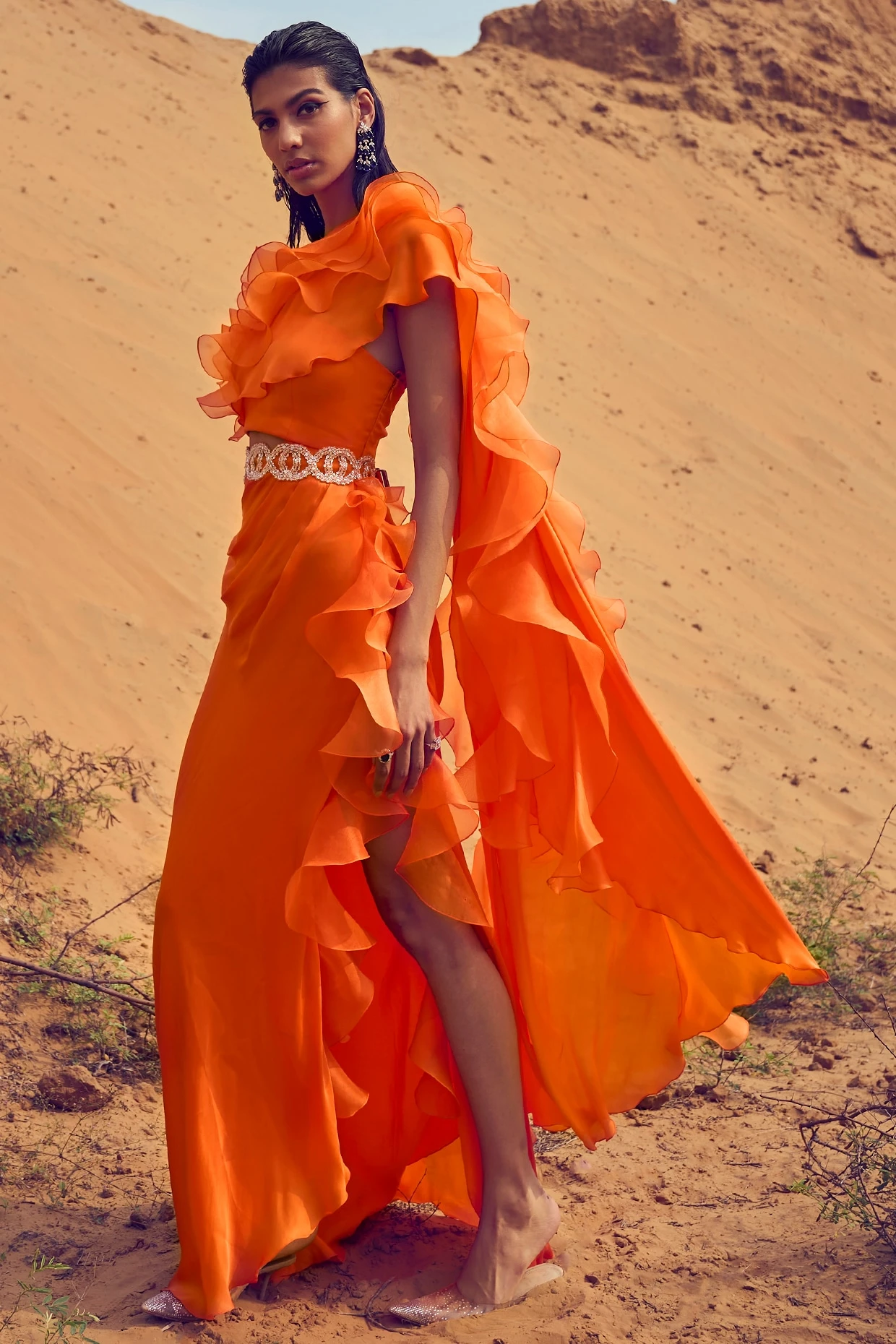 Featuring an orange ruffled dress in satin georgette base. It is paired with a contrasting belt.
