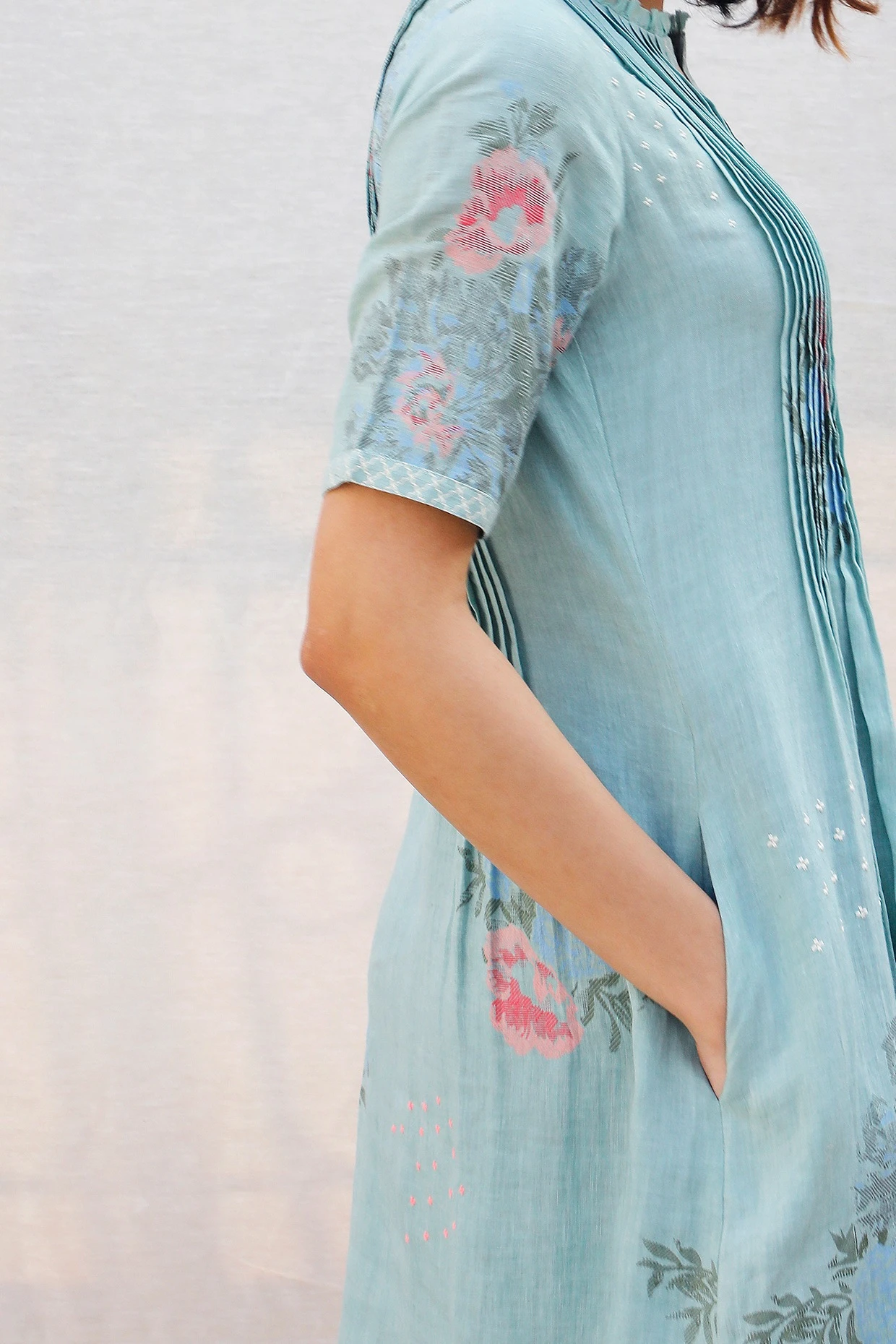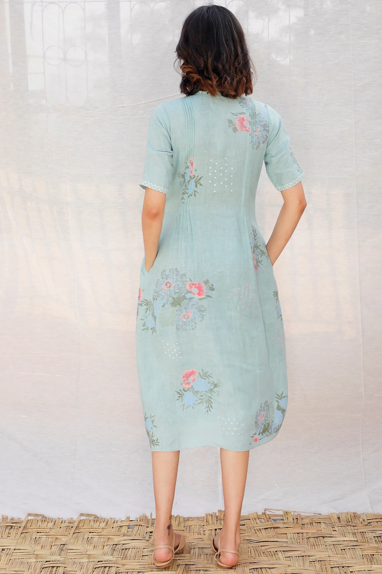 Featuring a mint pleated dress in linen base with rose print and thread embroidery. This contains only one piece.