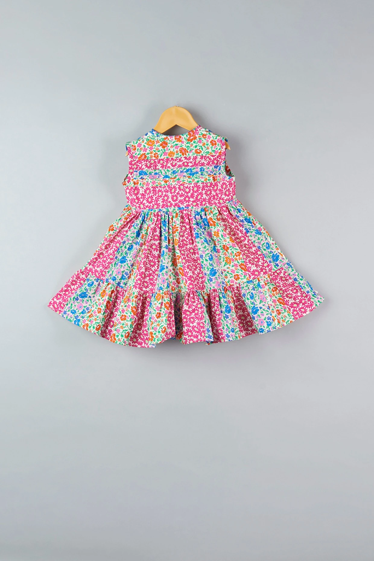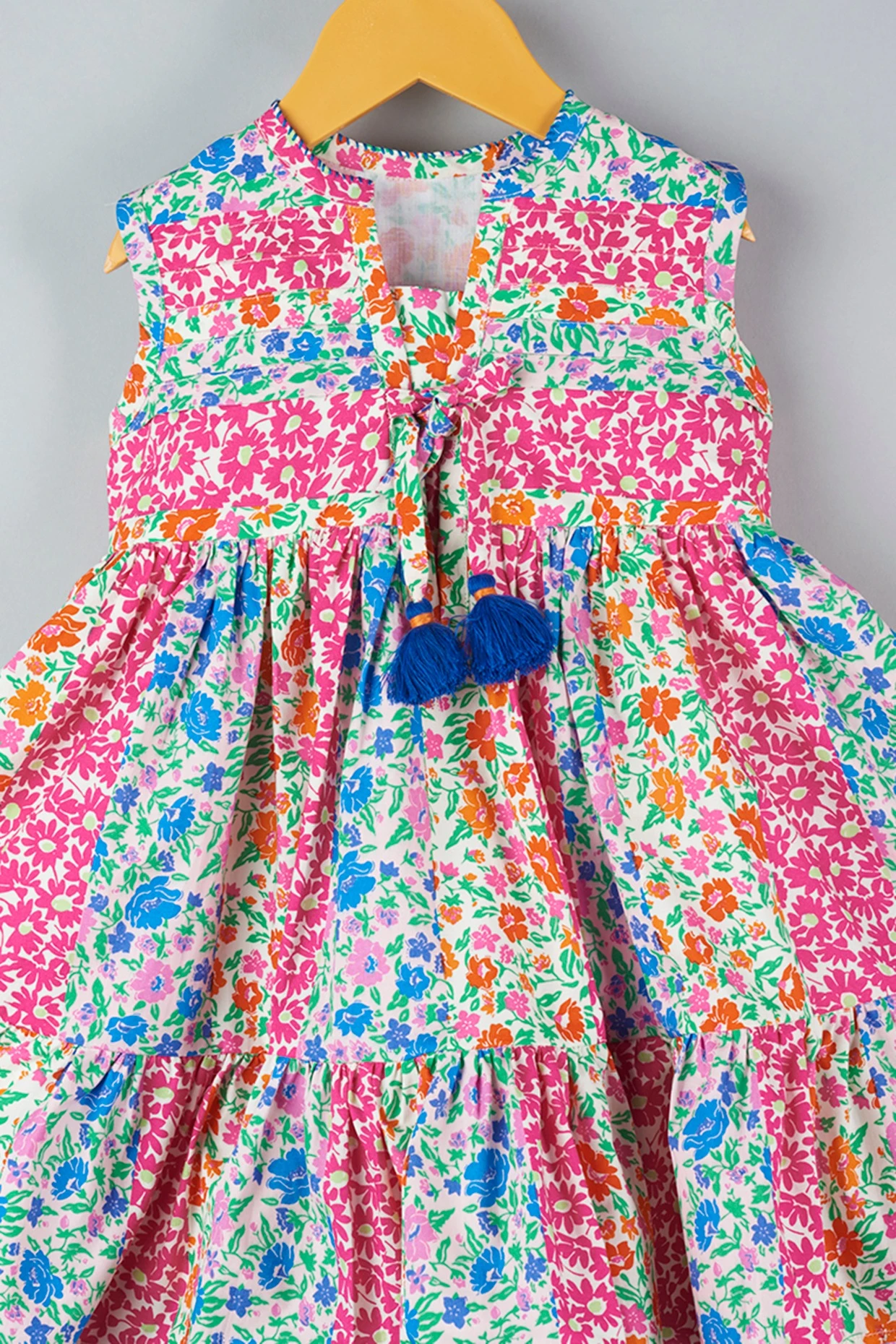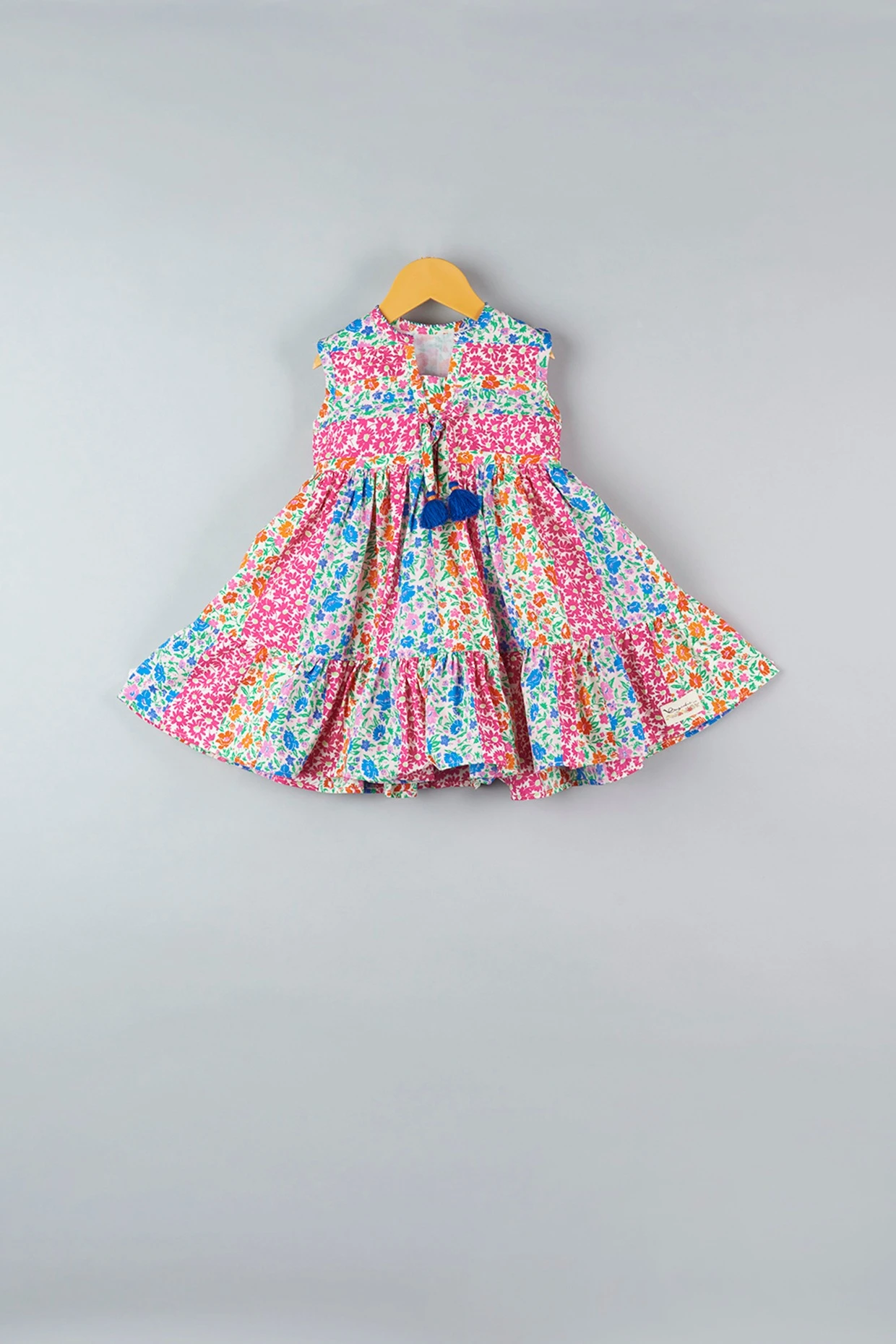 Featuring a bright pink pleated dress in cotton base with floral print and tassel detailings.