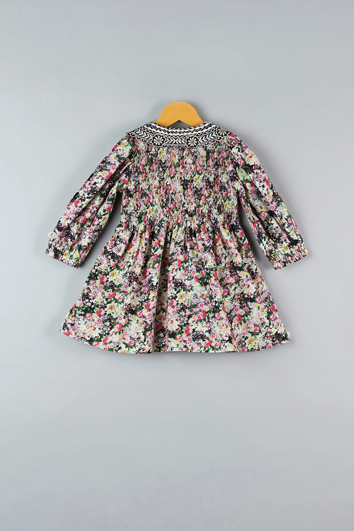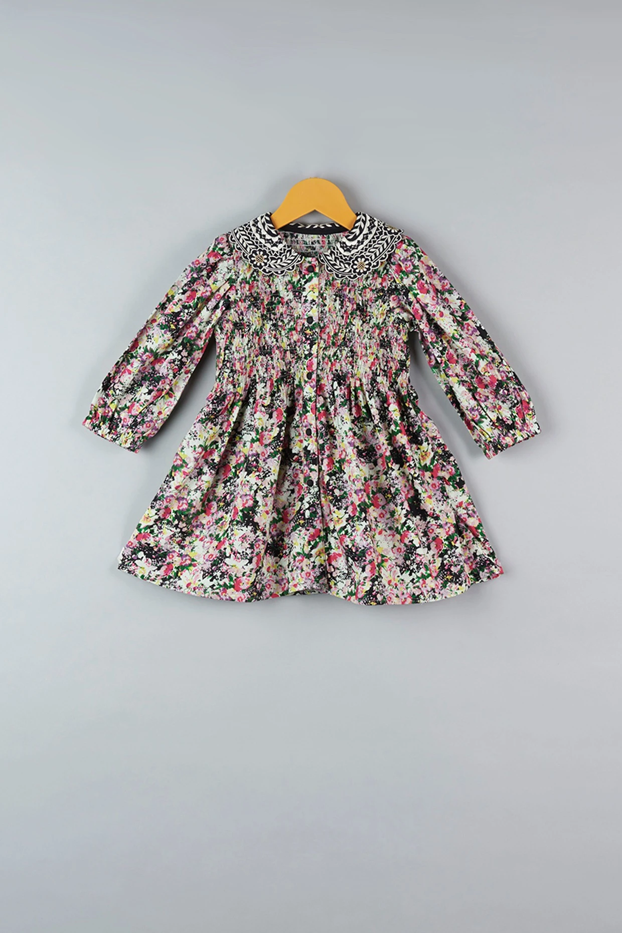 Featuring a multi-colored dress in cotton satin base with smocking print and embroidery.