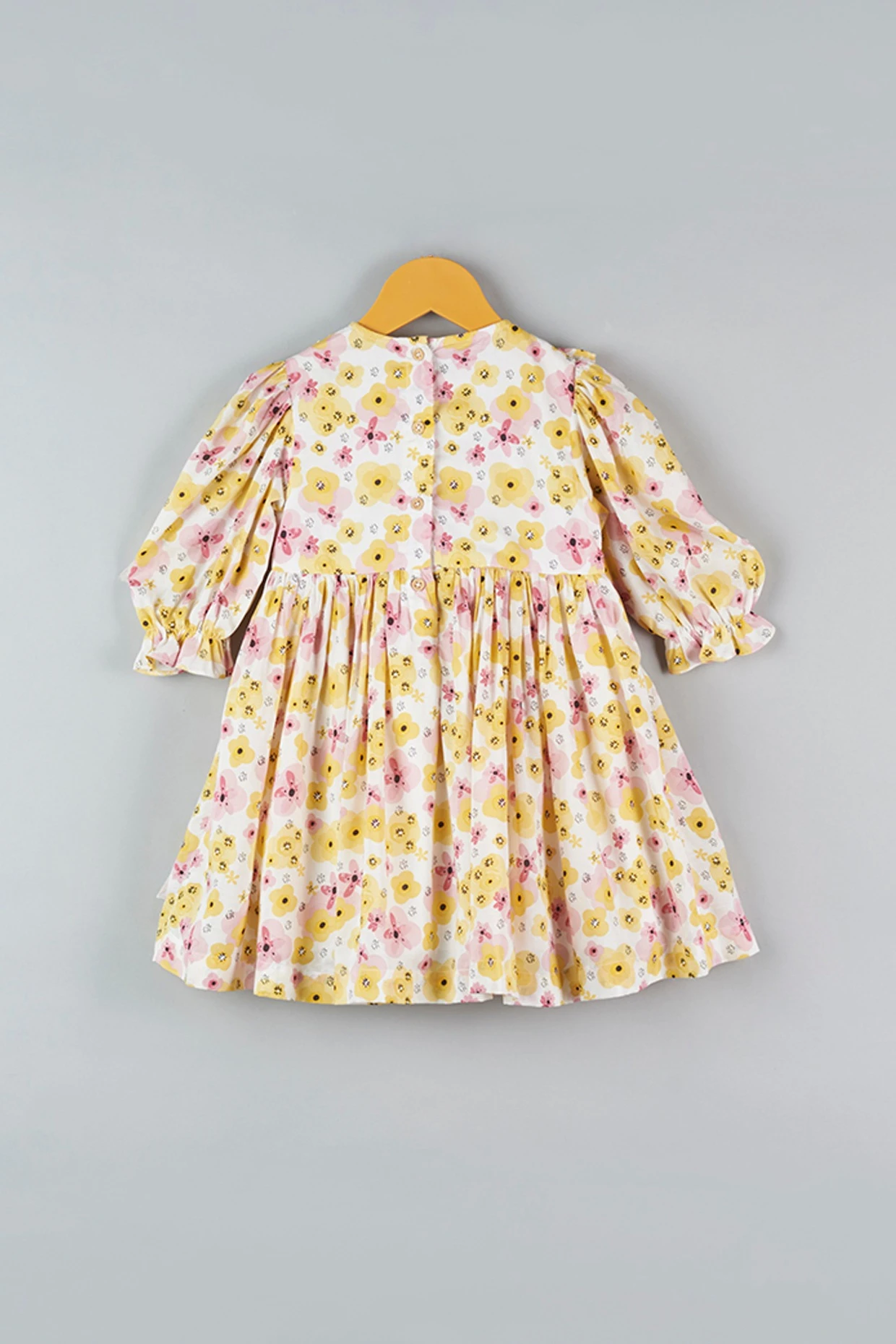 Featuring a yellow dress in cotton silk base with print and sequins embellishments.