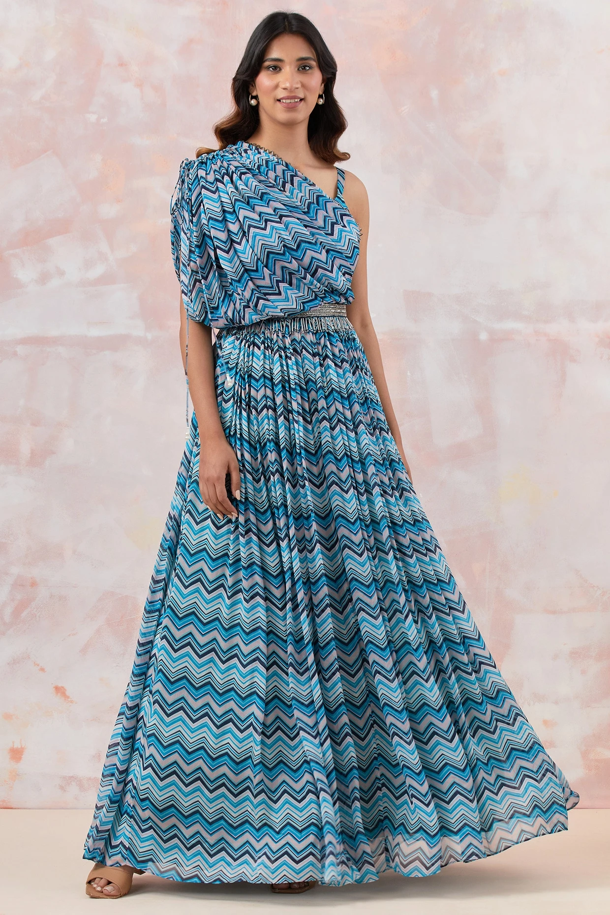 Featuring a blue maxi dress in chinon base. It is paired with an embroidered belt.