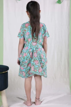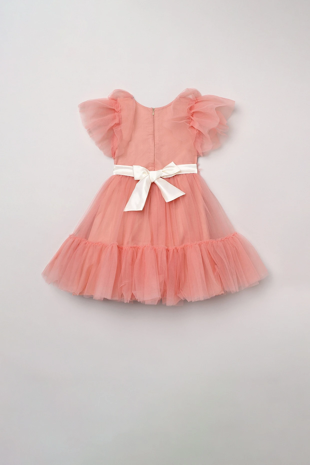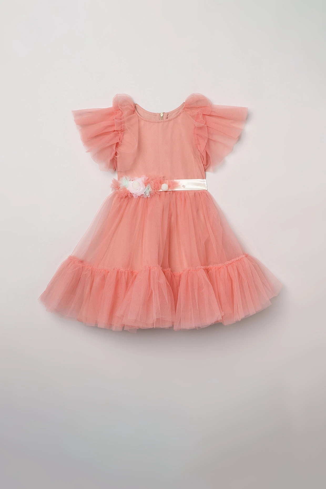 Featuring a peachy pink dress in tulle and poly base with pearl and 3D floral embellishments.
