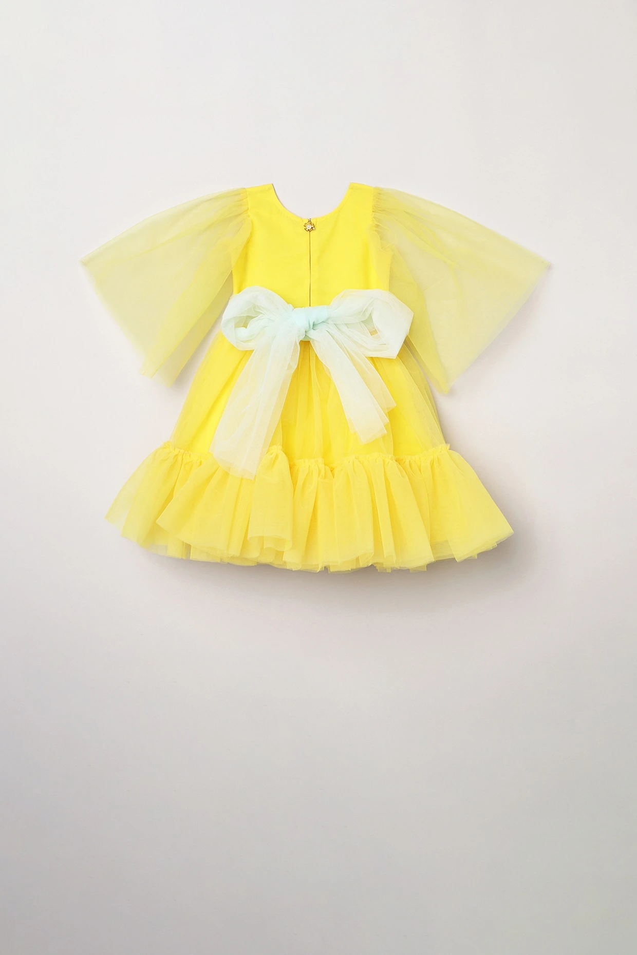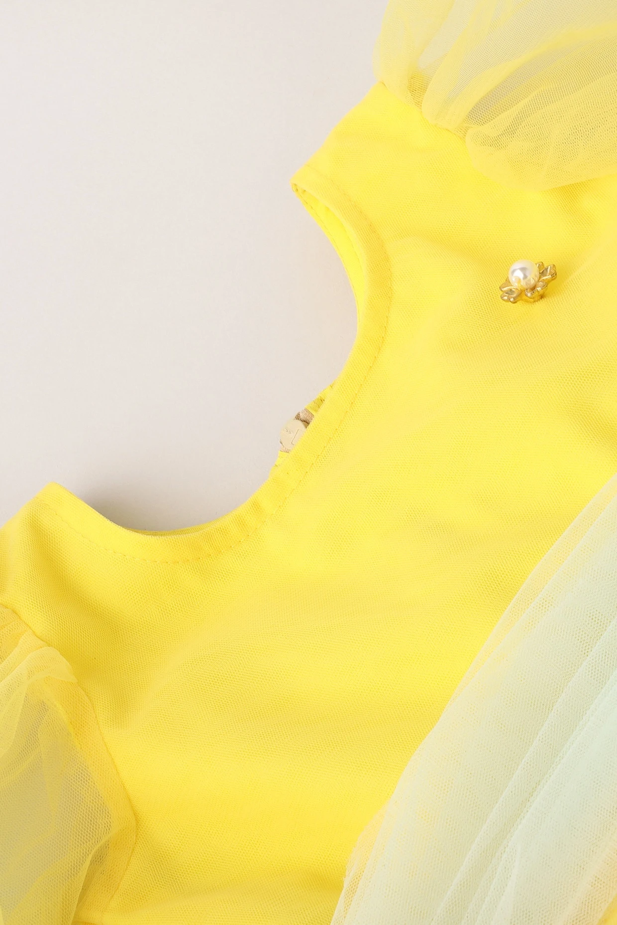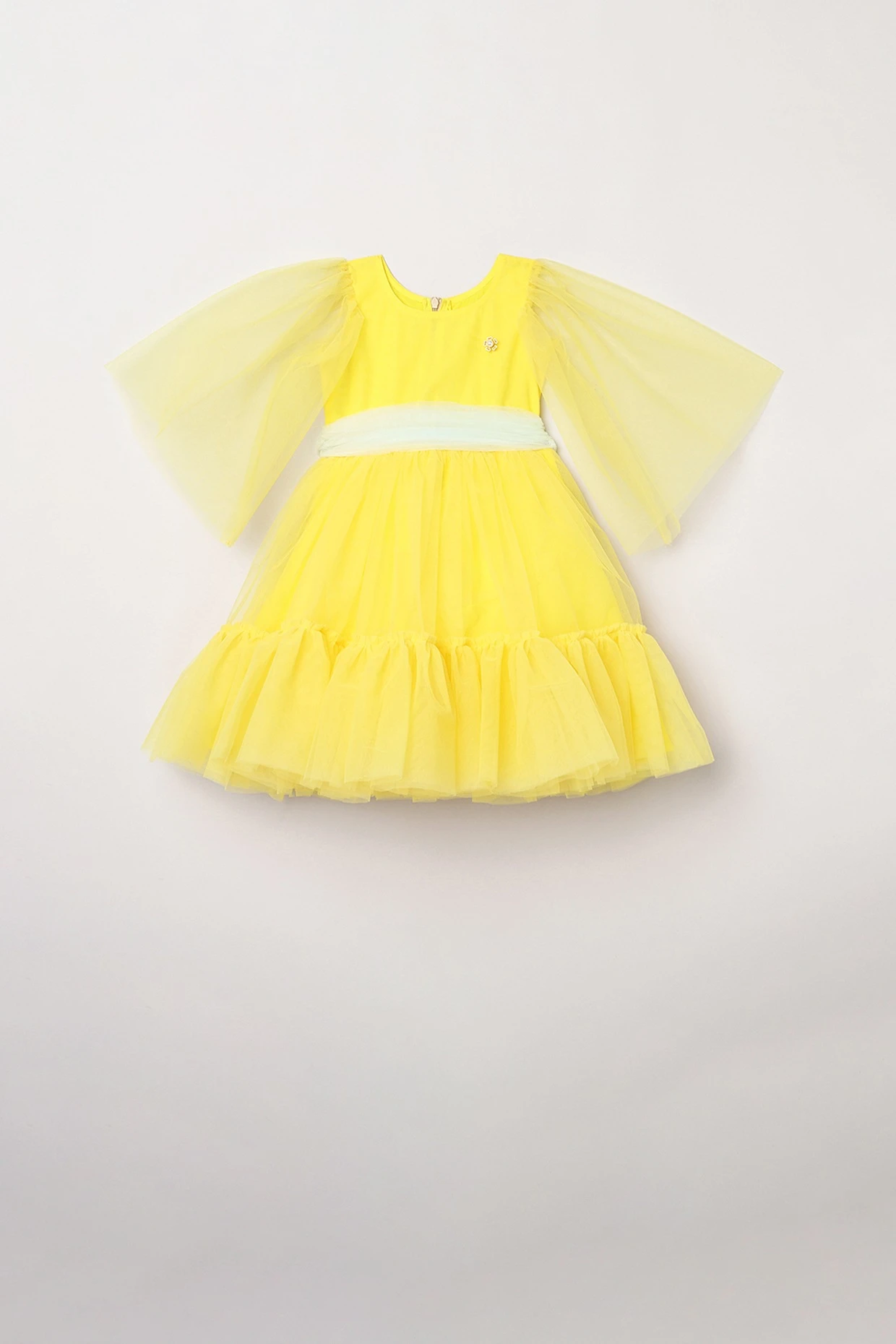 Featuring a yellow dress in tulle and poly base with pearl brooch and a contrasting belt.