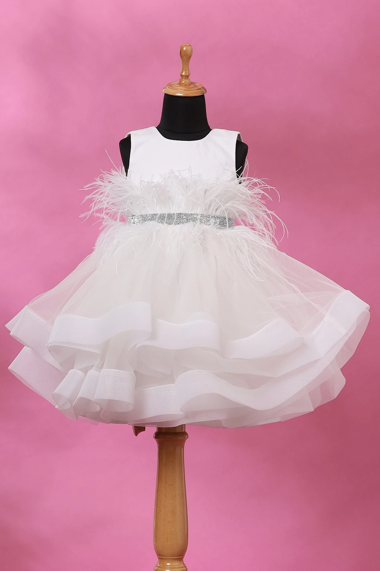 Featuring a white dress in net base with feathers. It is paired with a contrasting silver belt.