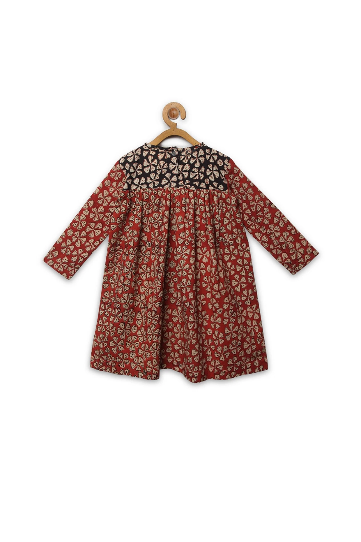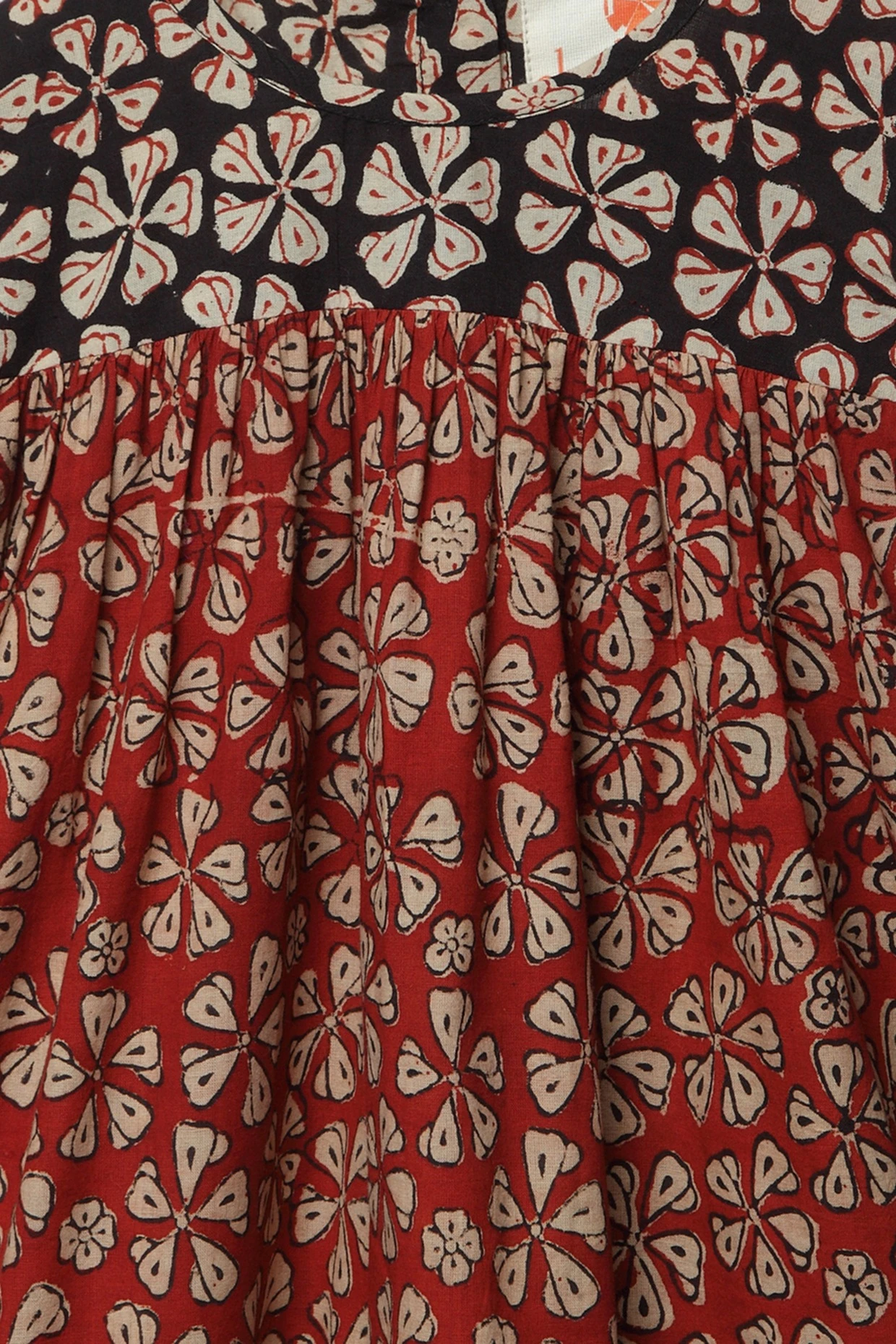 Featuring a red floral A-line dress in cotton base with button opening at back and block print.