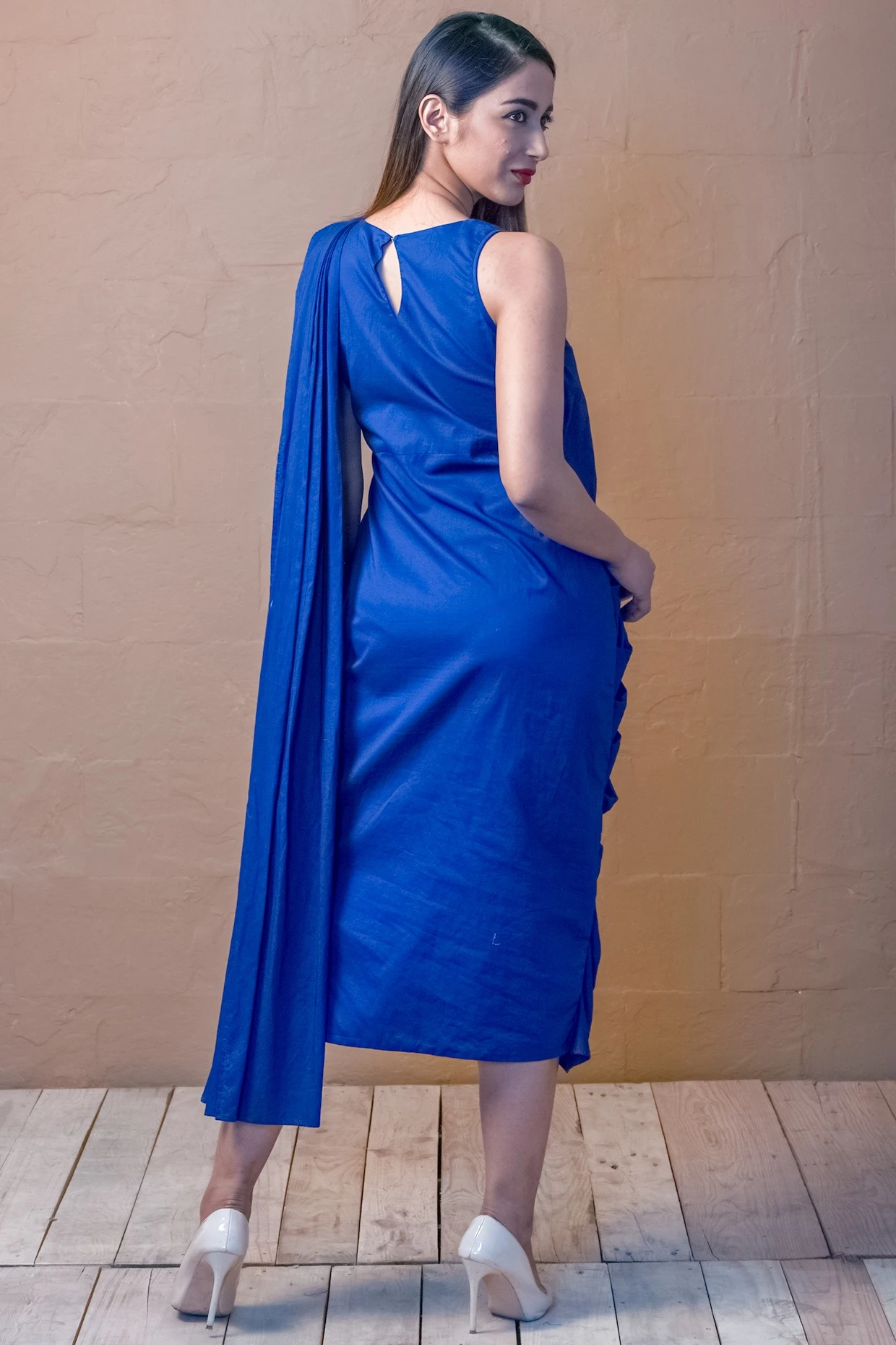 Featuring a navy blue pre-stitched saree dress in cotton base with gota embroidery. This contains only one piece.