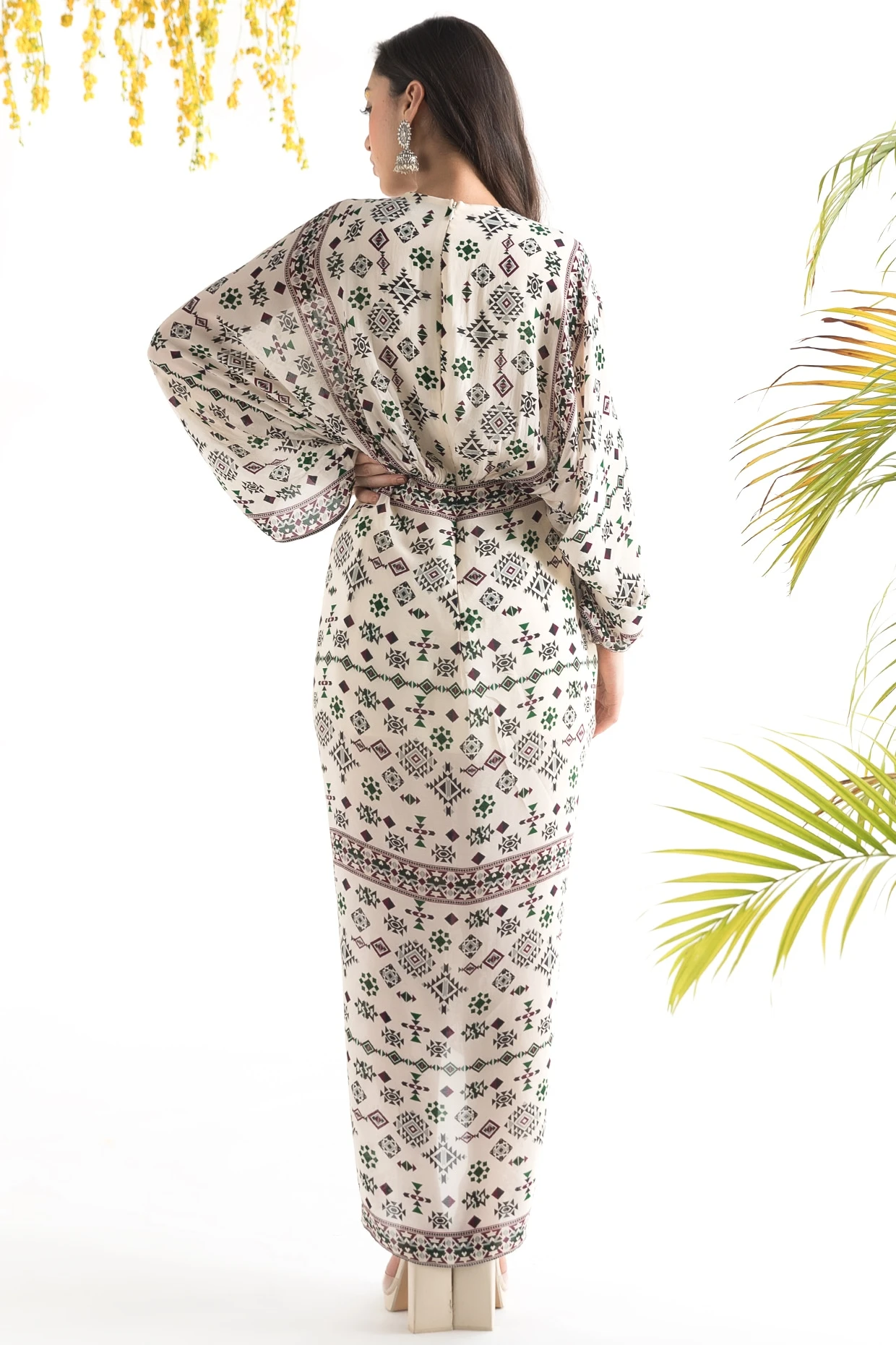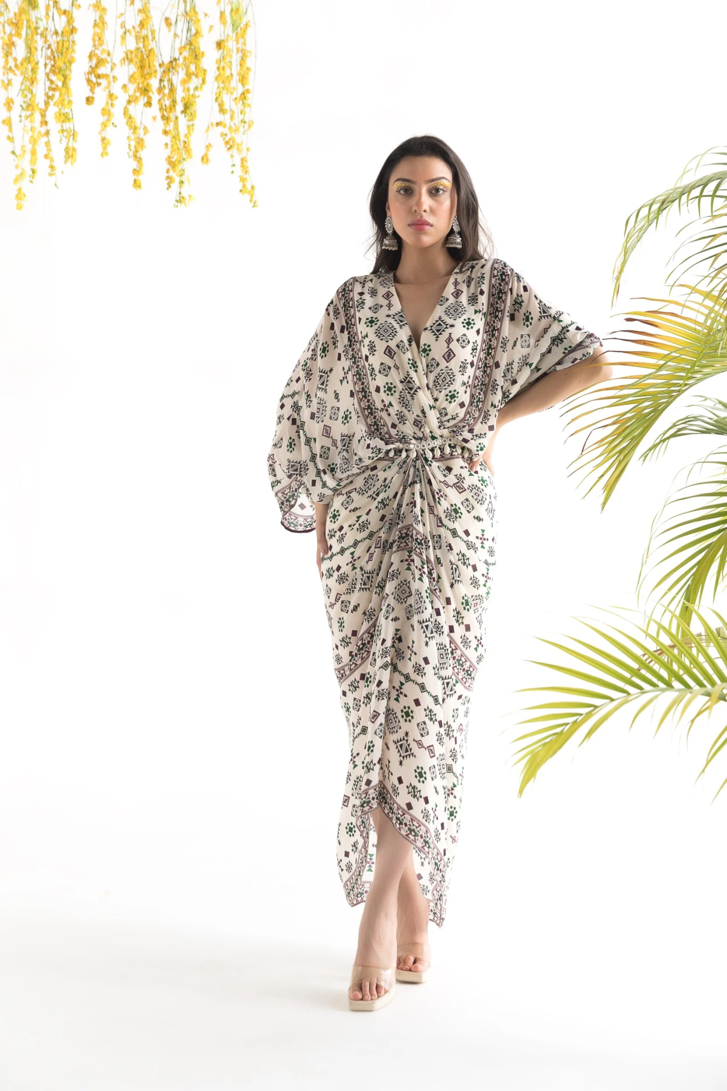 Featuring an ivory draped kaftan dress in crepe base with print.