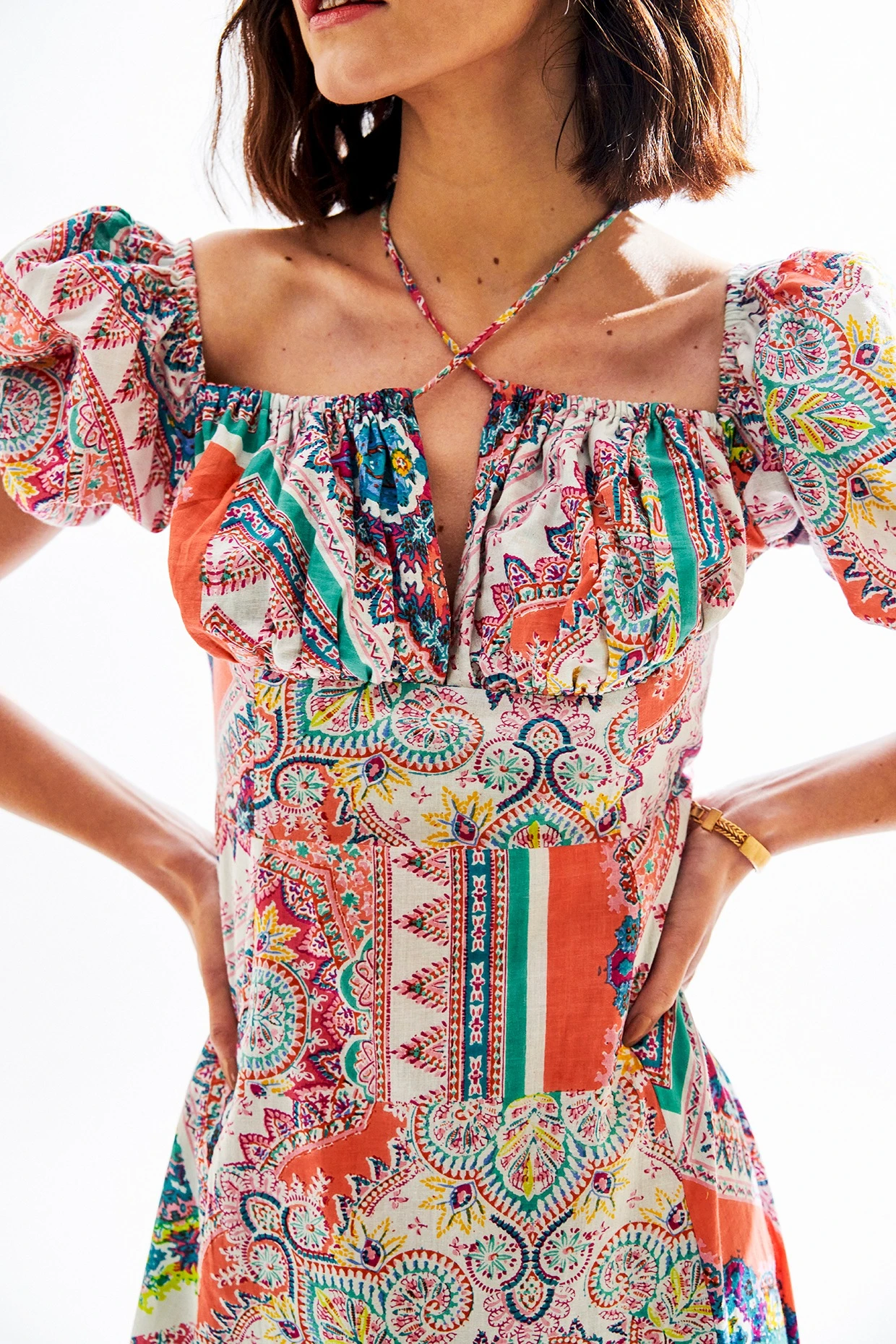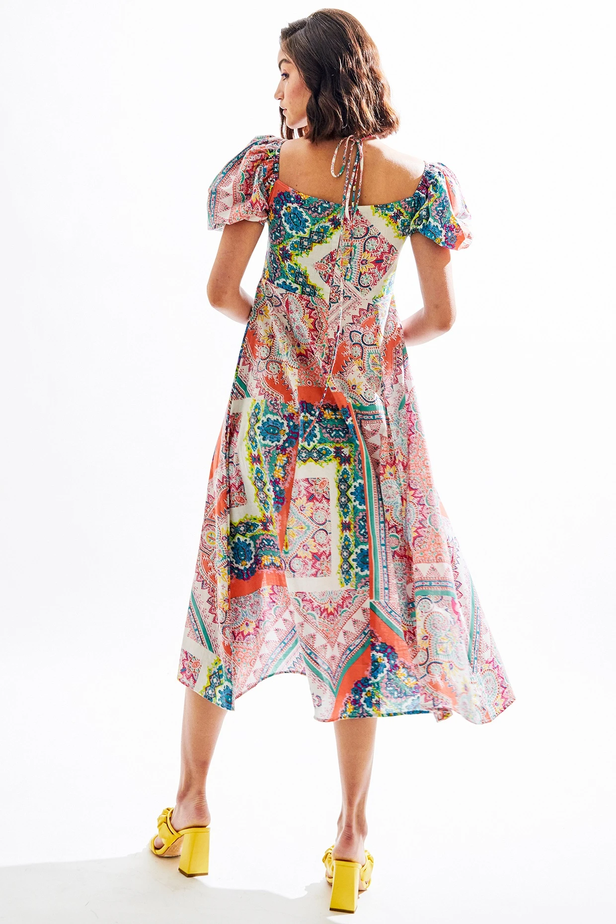 Featuring a multi-colored dress in cotton base with geometric print and balloon sleeves.