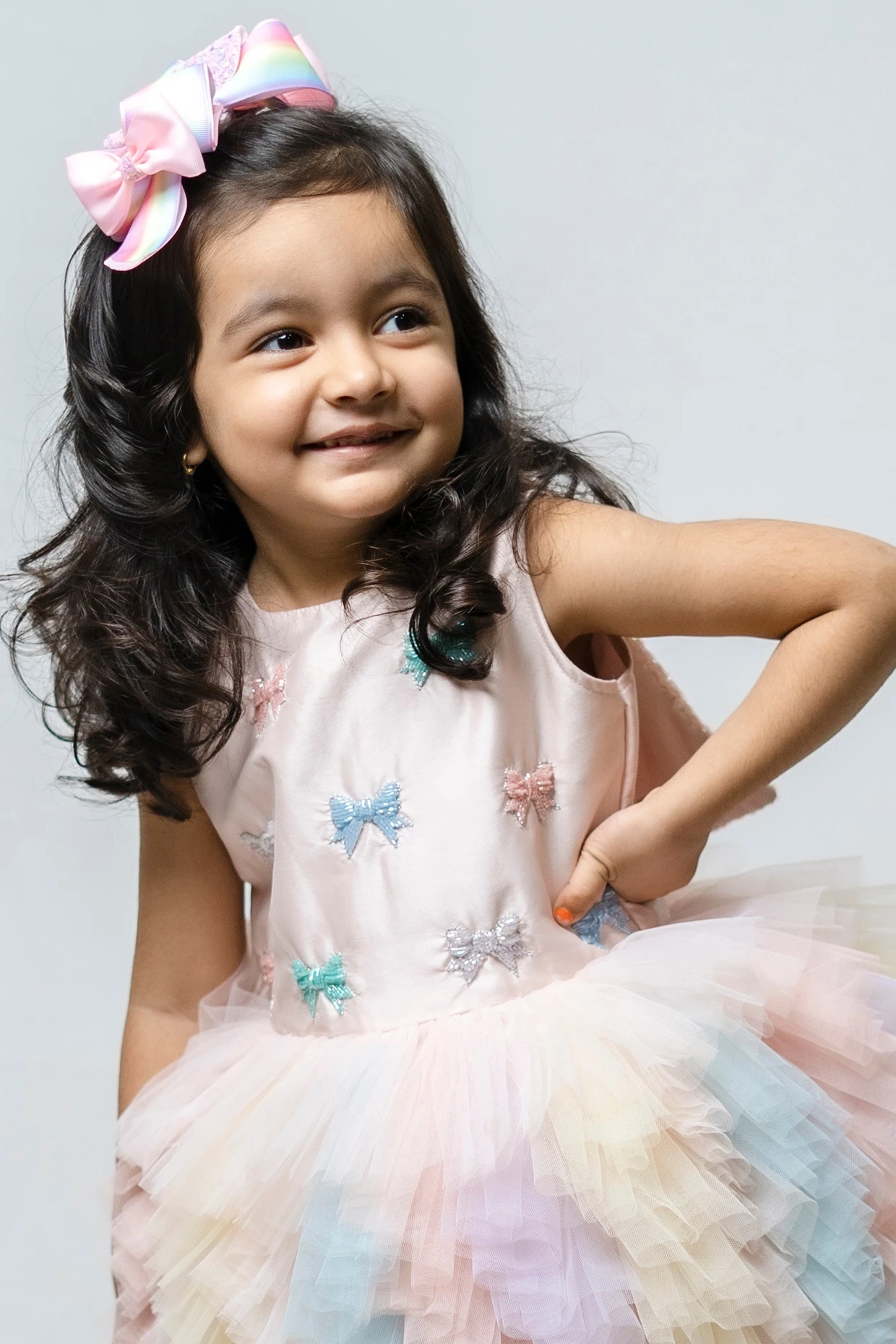 Featuring a powder pink ruffled dress in taffeta silk and tulle base with hand embroidery and a bow tie.