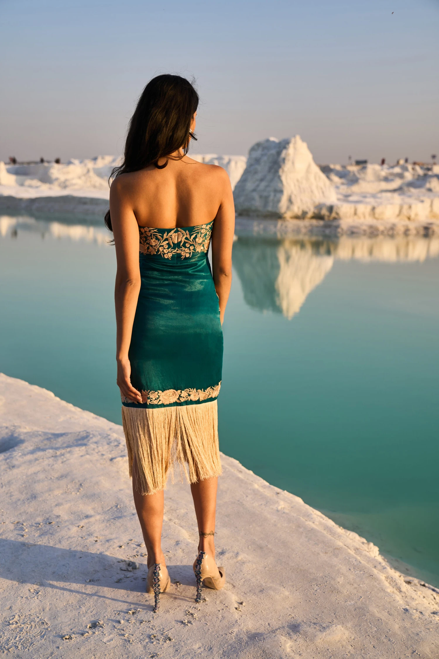Featuring a teal off-shoulder midi dress in tencel base with fringe details and gara stitch embroidery.