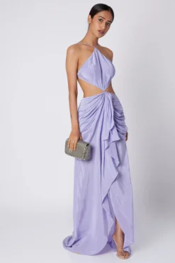 Featuring a purple backless cut out dress in VFY and modal base. It has a concealed zipper closure.