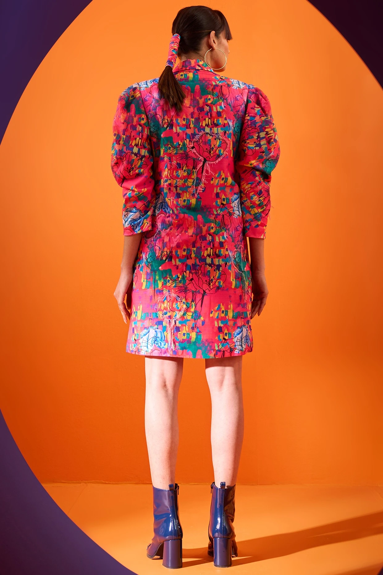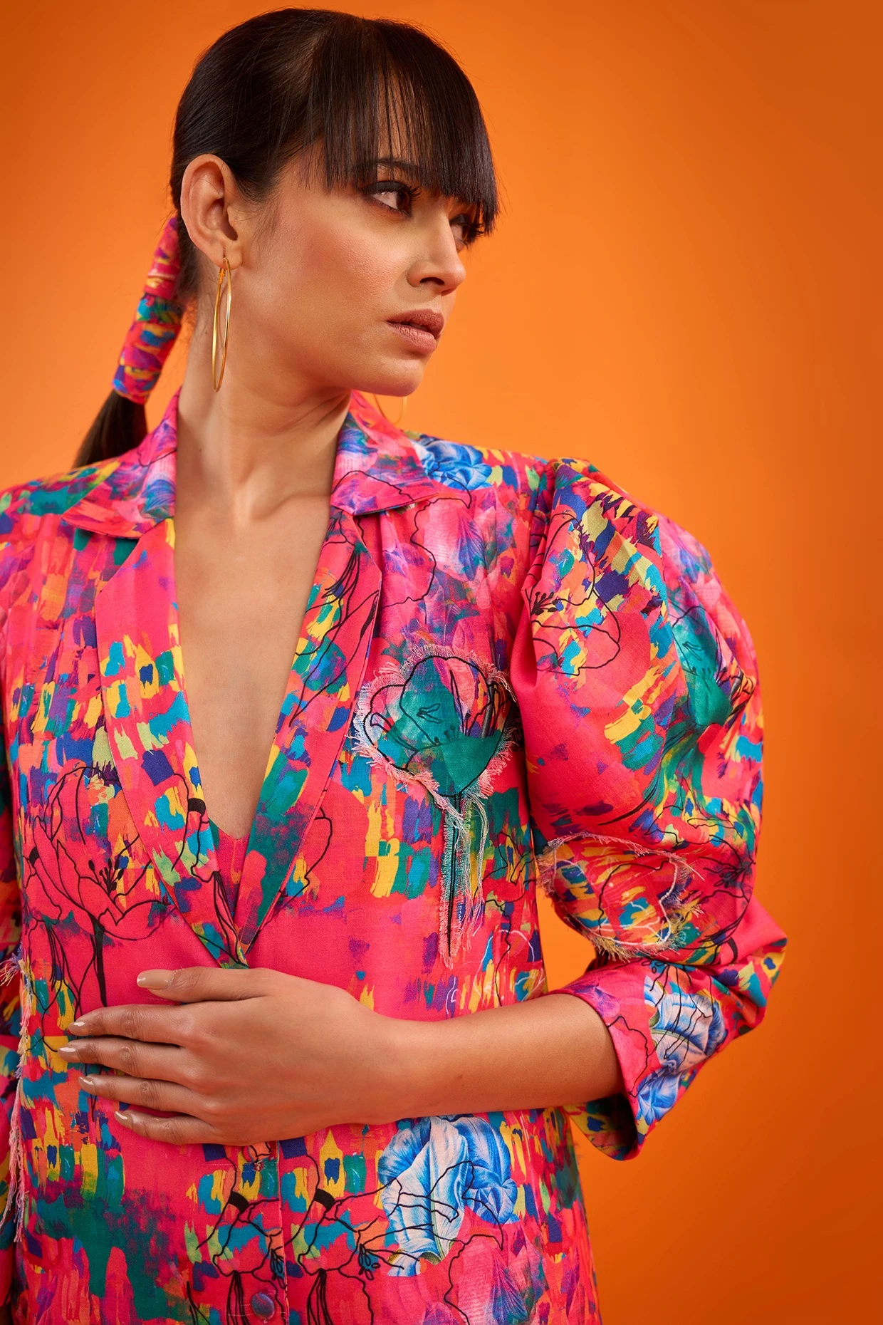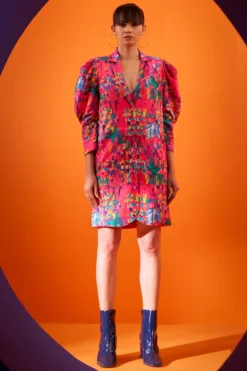 Featuring a pink blazer dress in art twill base with digital print and flower patch embroidery, including puff sleeves.