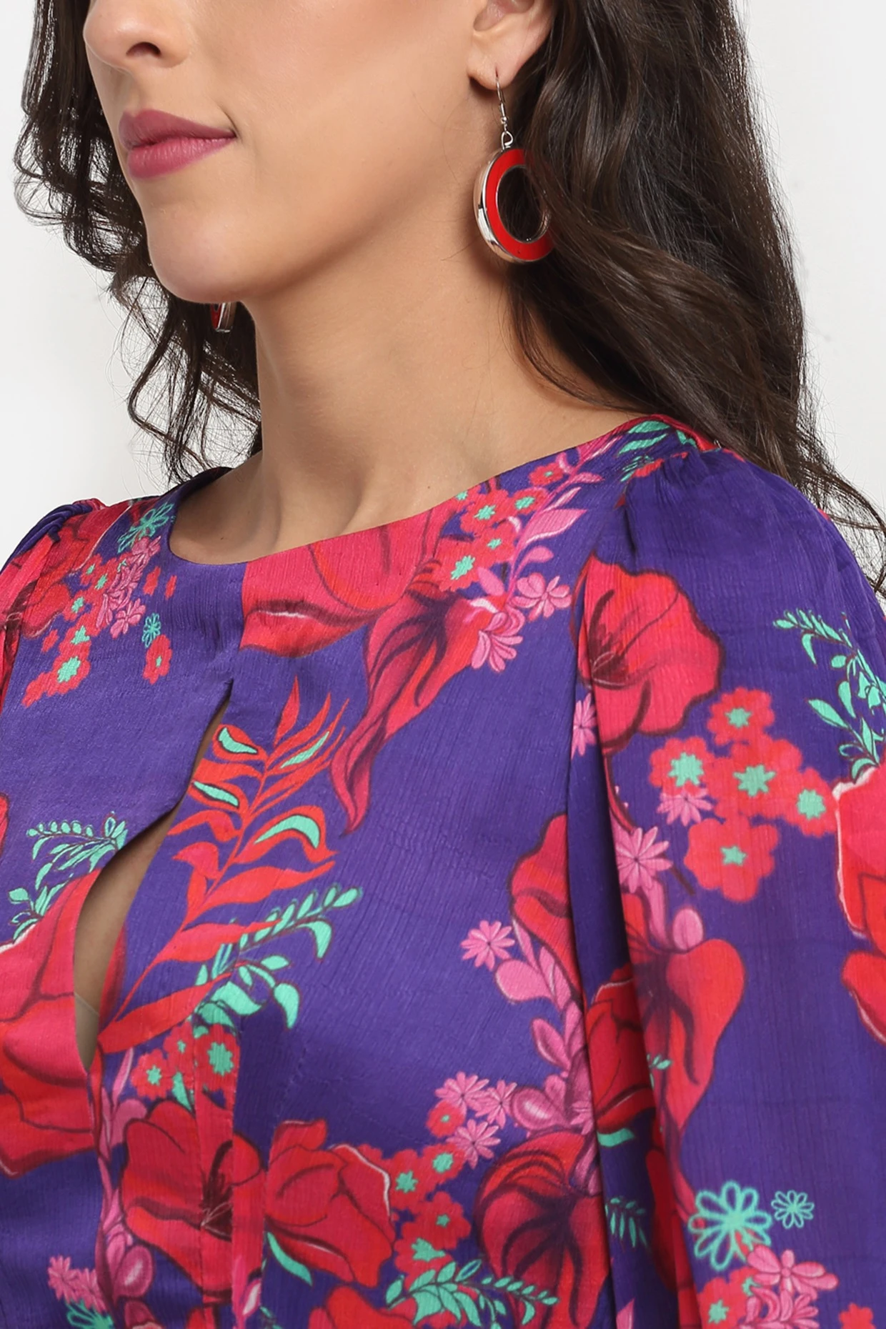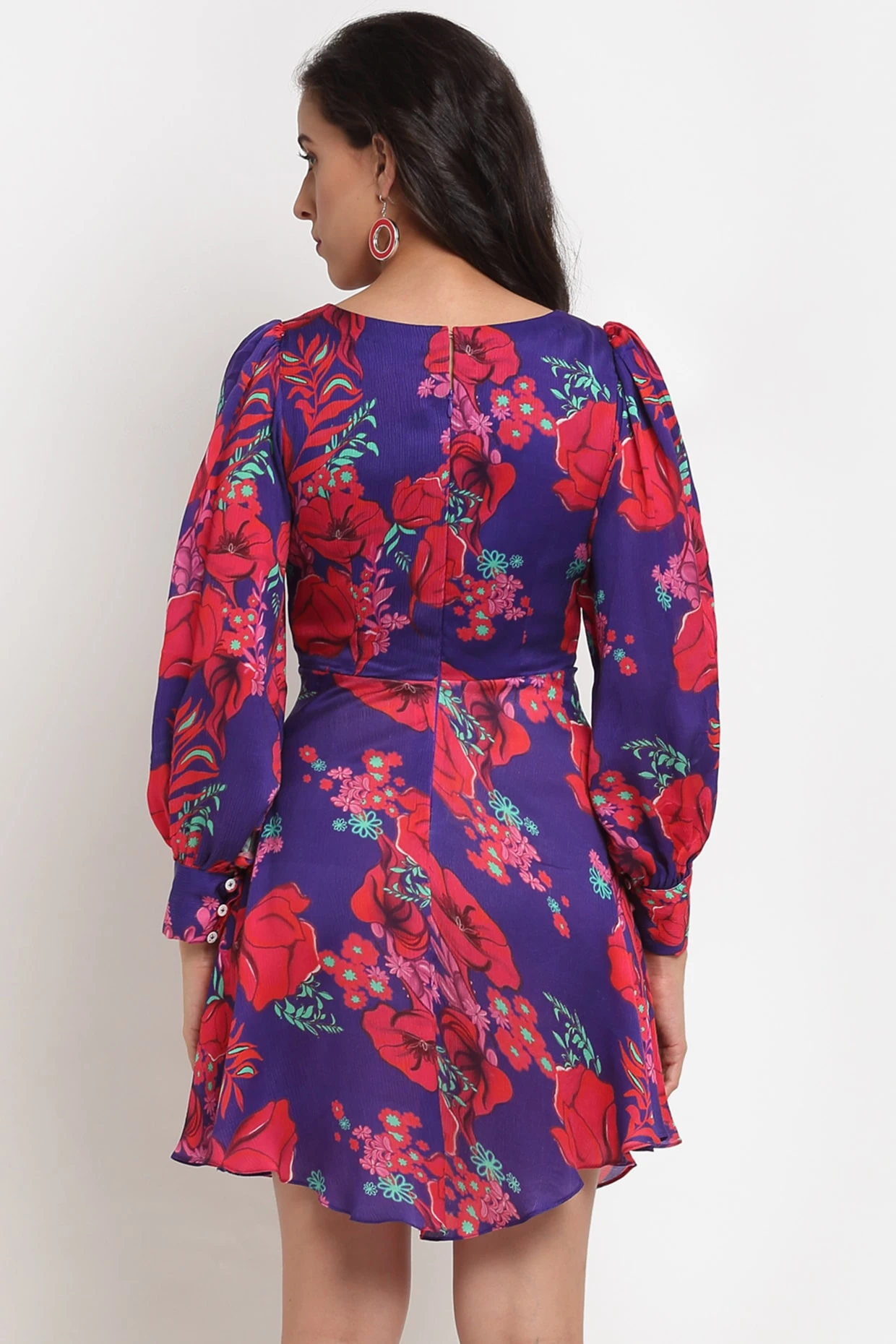 Featuring a multi-colored mini dress in chiffon base with floral print and puffed sleeves.