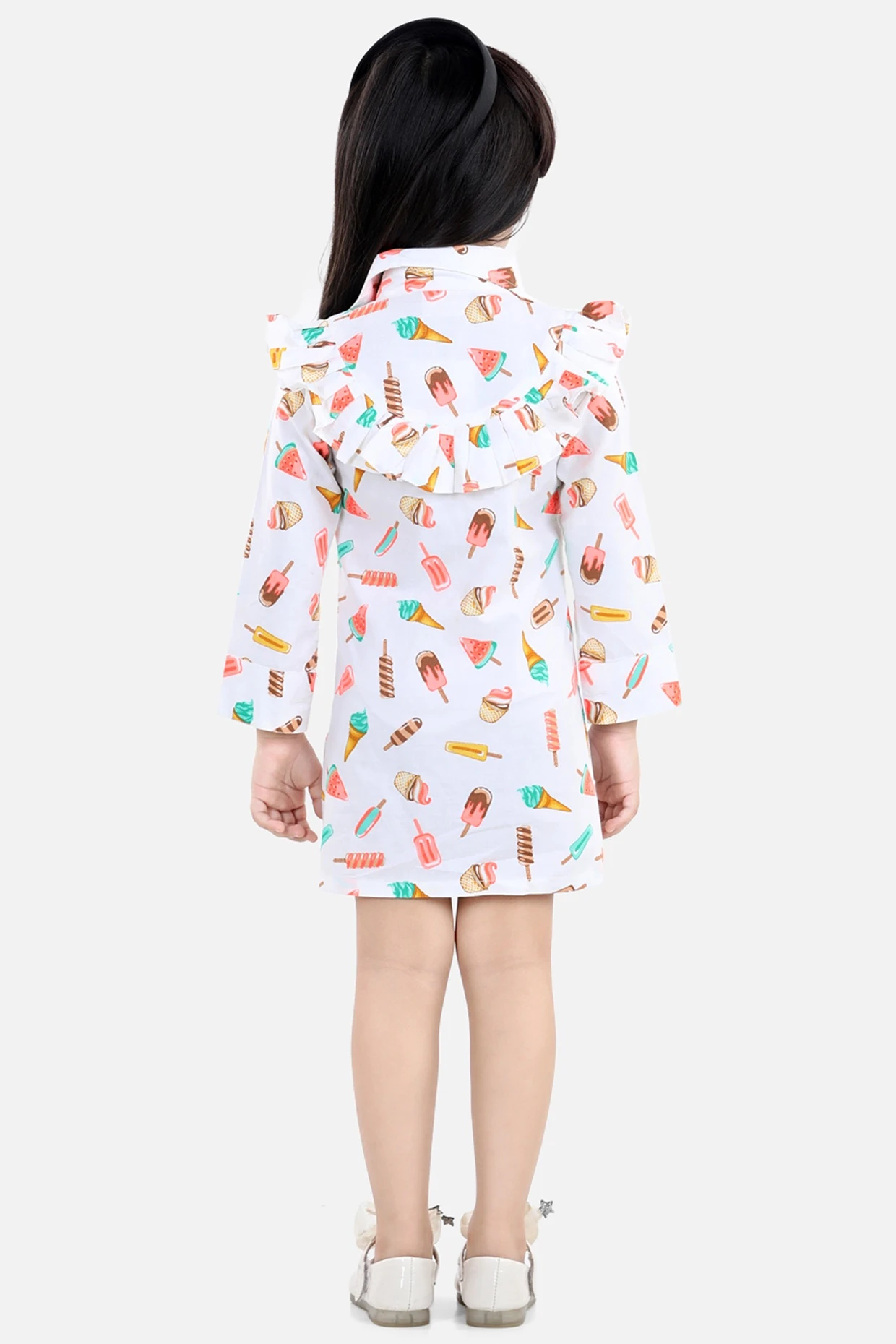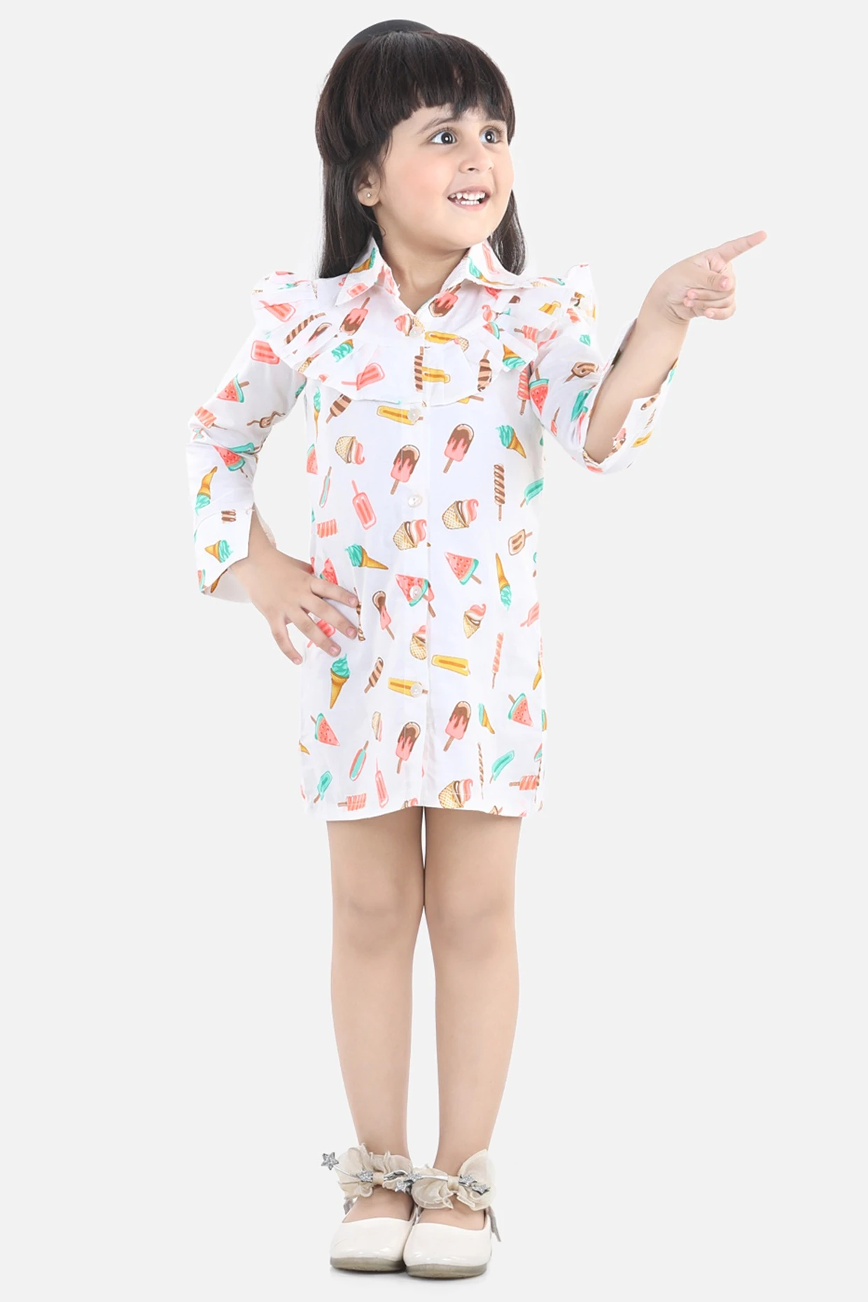 Featuring a white shirt dress in cotton base with multi-colored print.