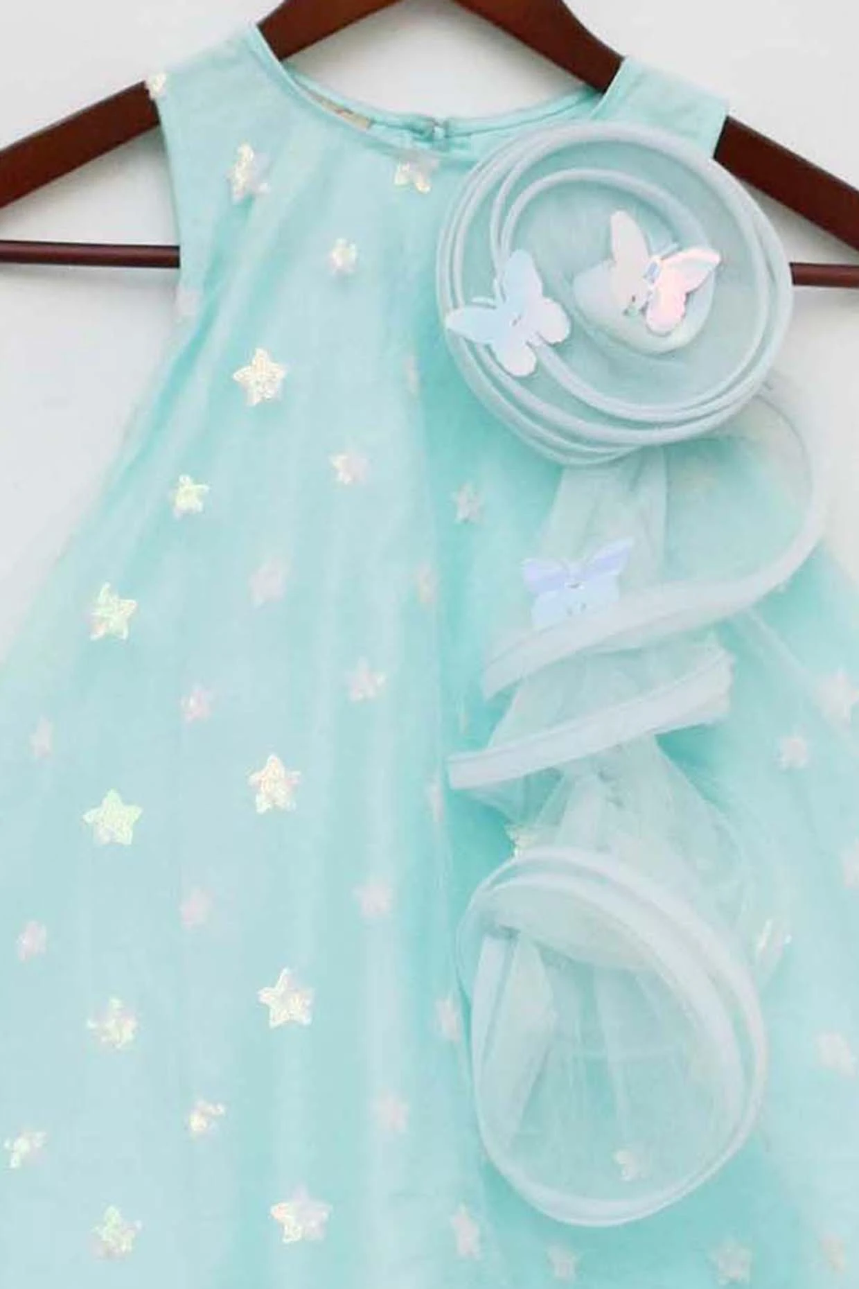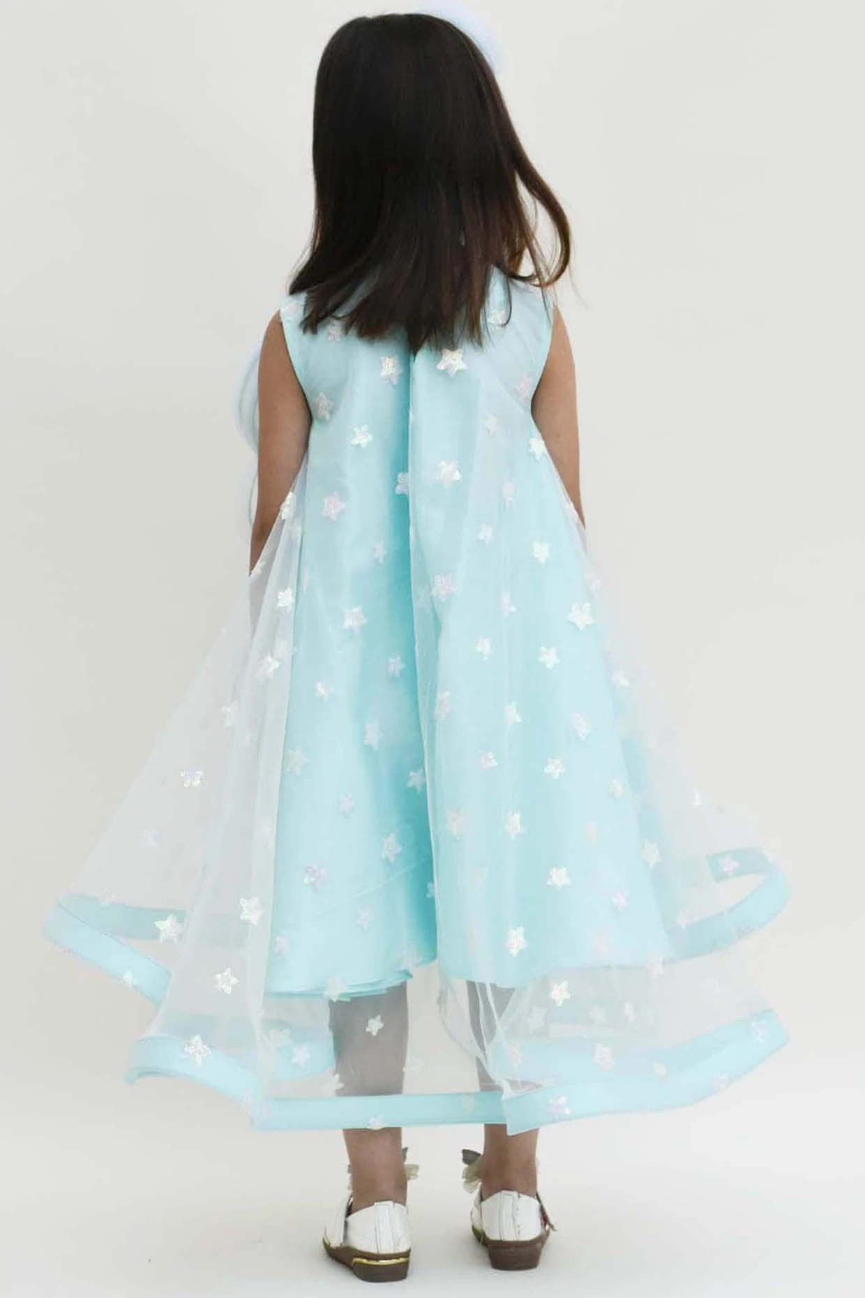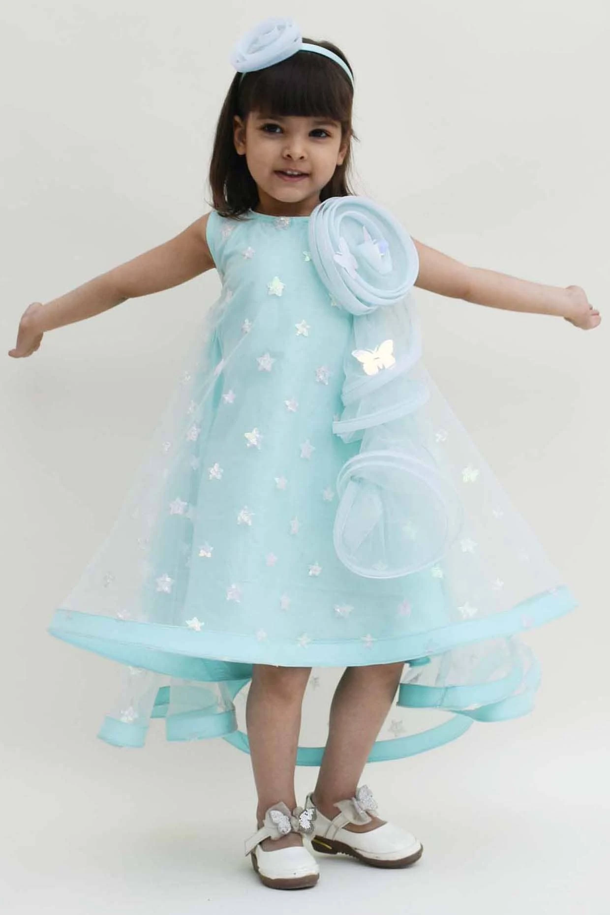 Featuring an arctic blue dress in net base with a high low hem, cape sleeves, 3D butterflies, and sequins embroidery.