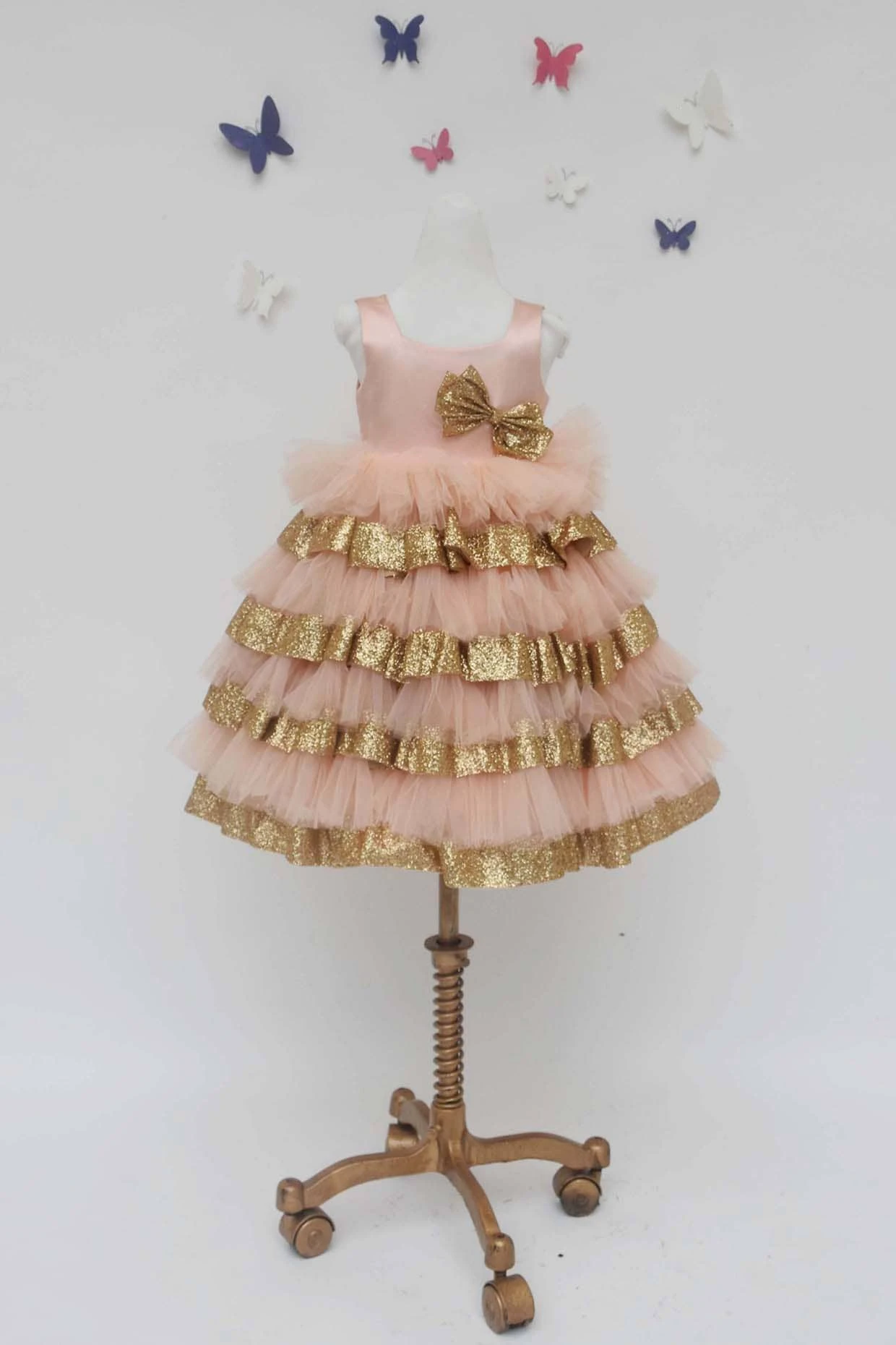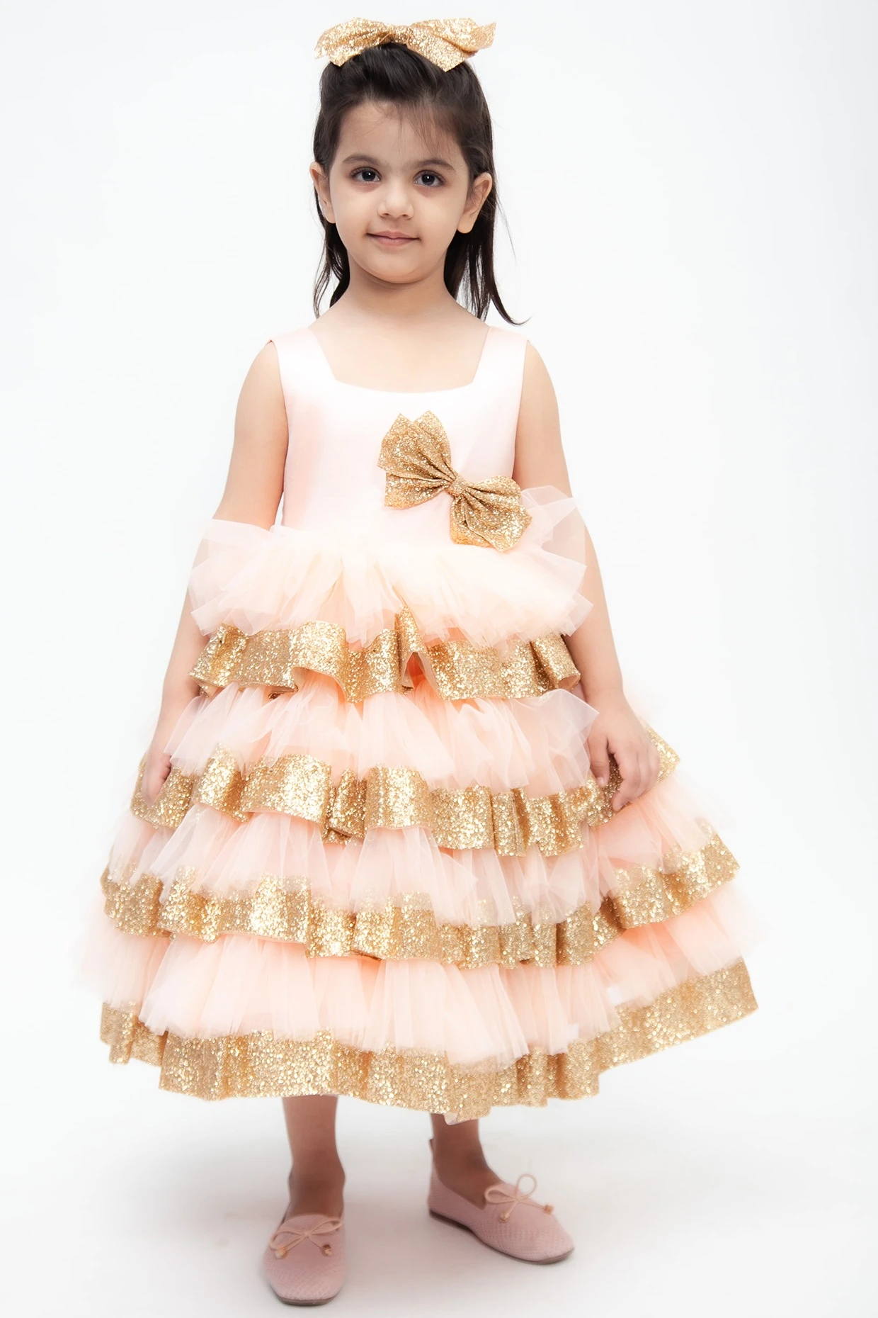 Featuring a peach dress in net base with multi layers and a bow.
