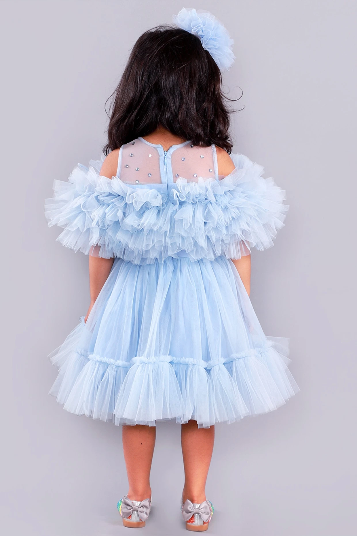 Featuring a blue layered dress in tulle, crepe, and cotton base with ruffled hem and crystals work. It is paired with a matching hair accessory.