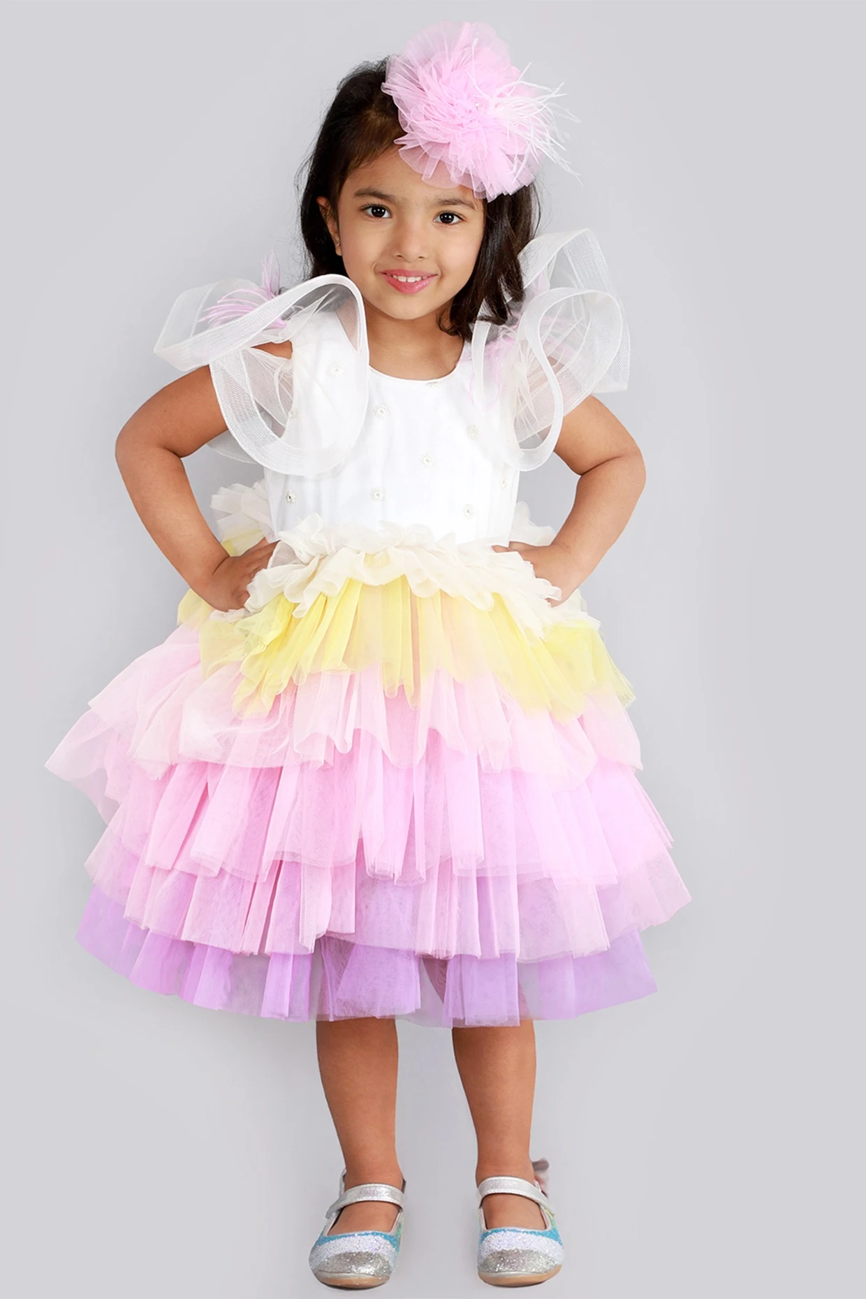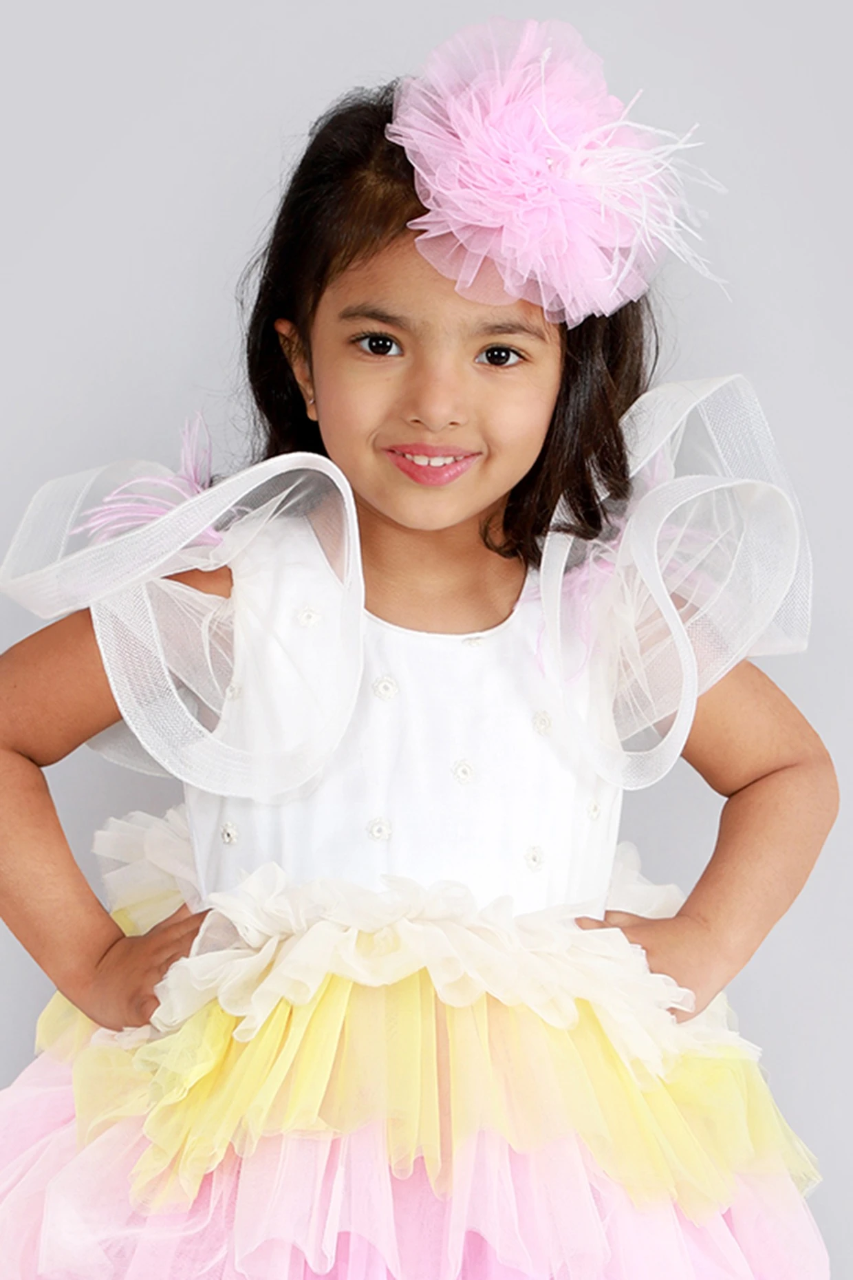 Featuring a multi colored tiered dress in tulle, net, dupion silk, and cotton base with exaggerated sleeves and thread work. It is paired with a matching hair accessory.