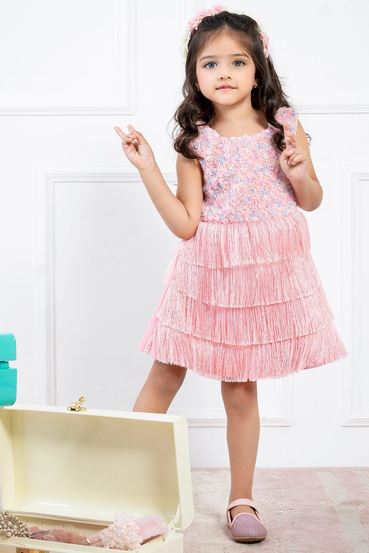 Featuring a light pink dress in tulle and net base with tassels.