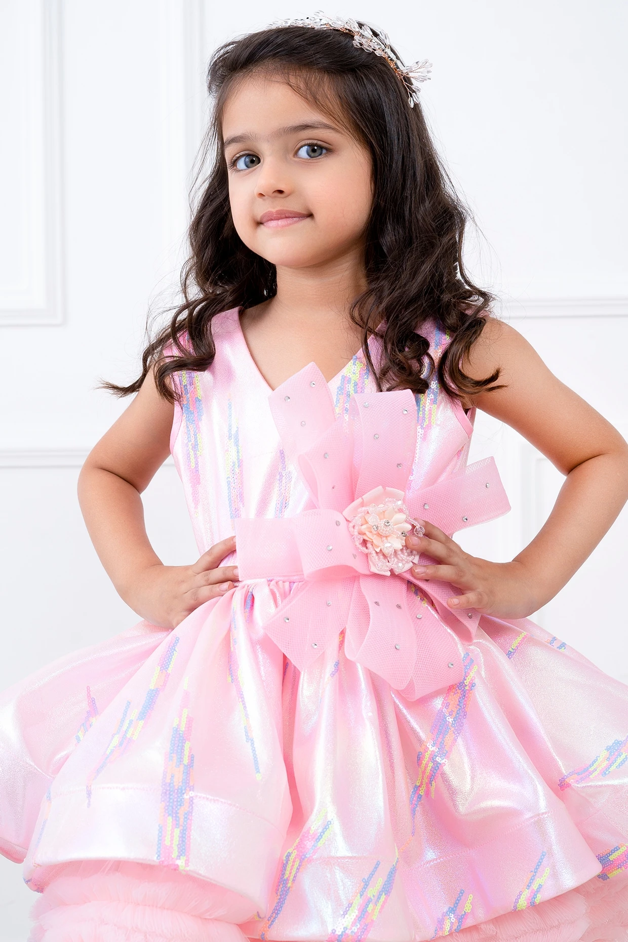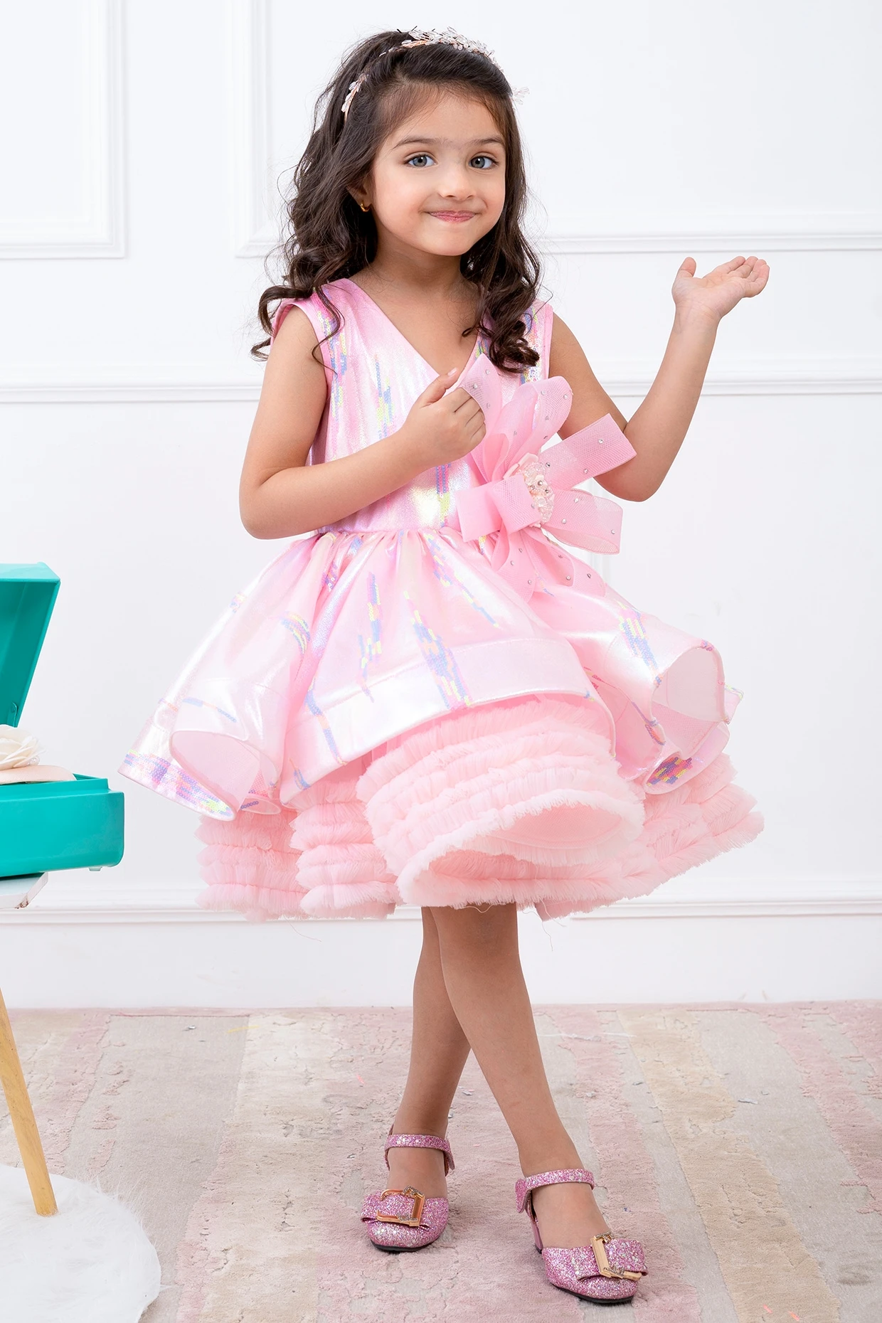 Featuring a pink flared dress in tulle and organza base with frills and a bow.