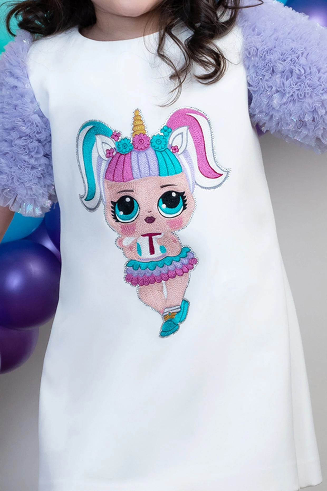 Featuring a white shift dress in crepe and tulle base with unicorn detailing.