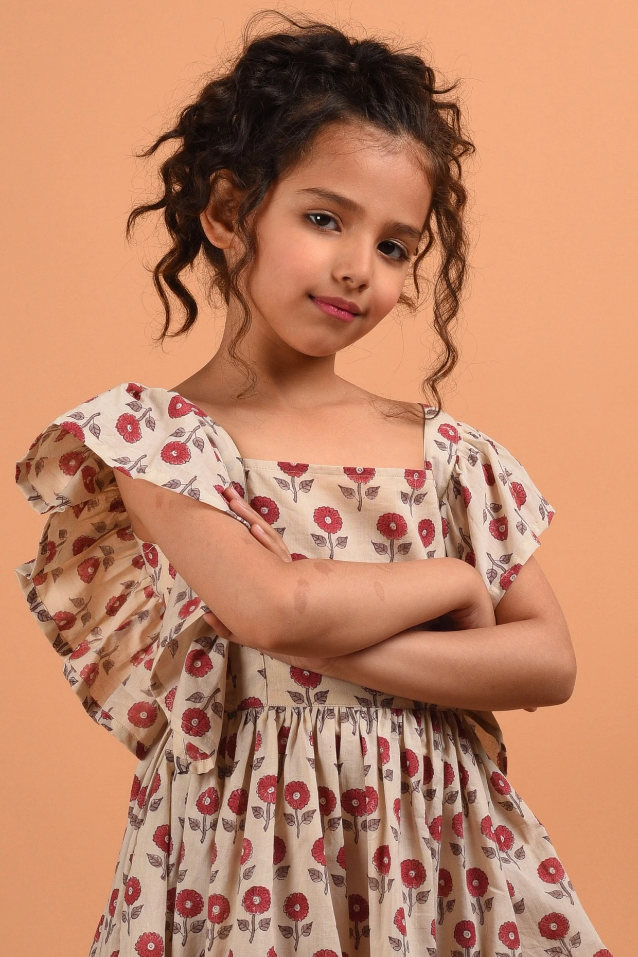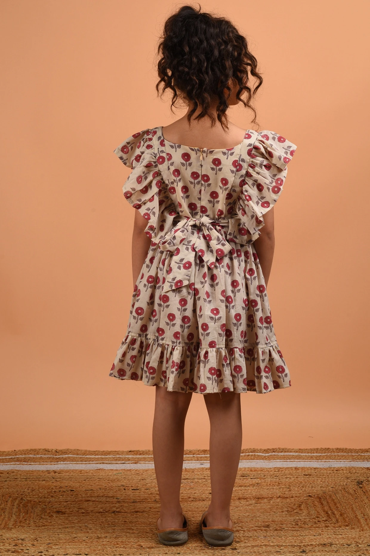Featuring a beige frilled dress in cotton base with floral print.