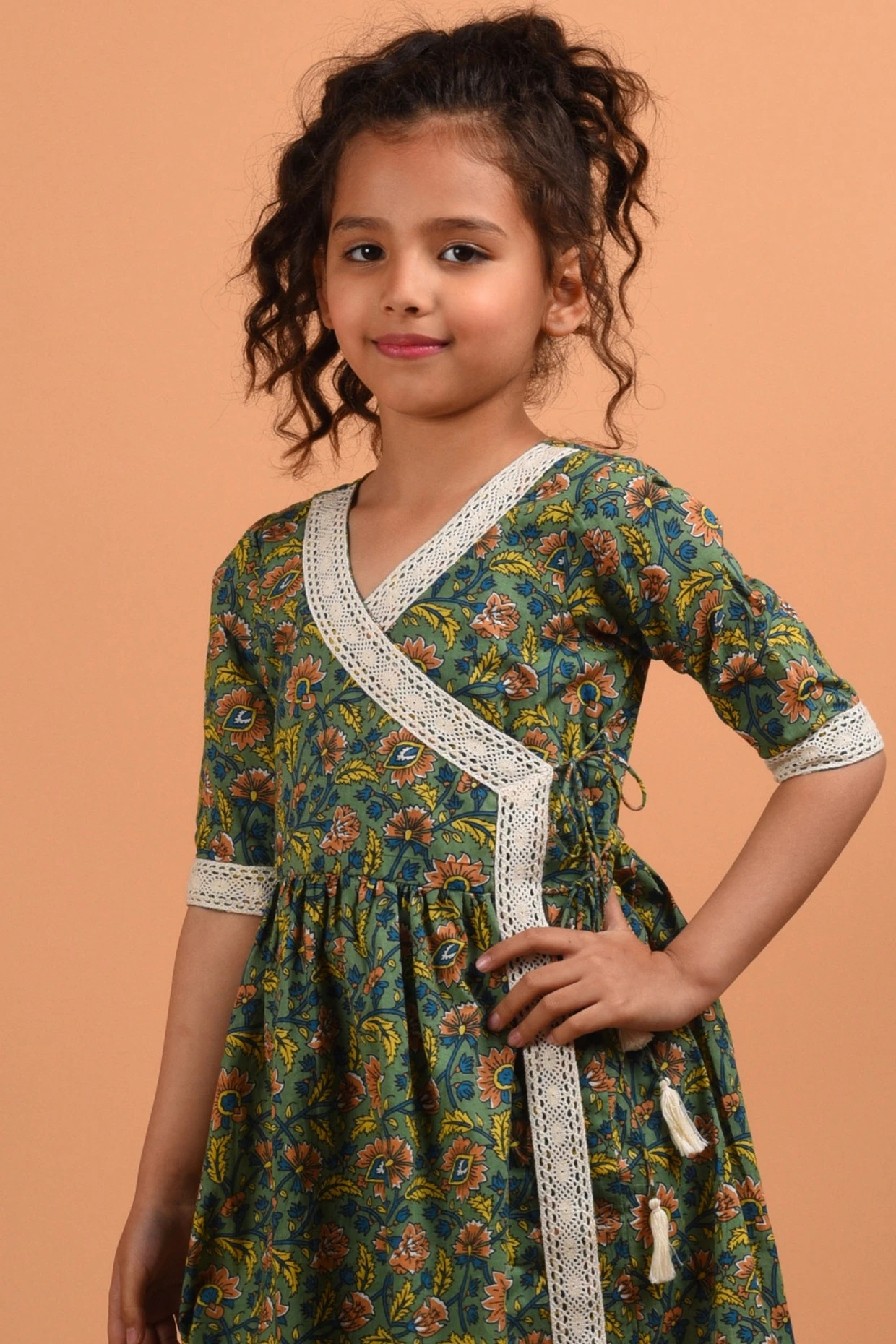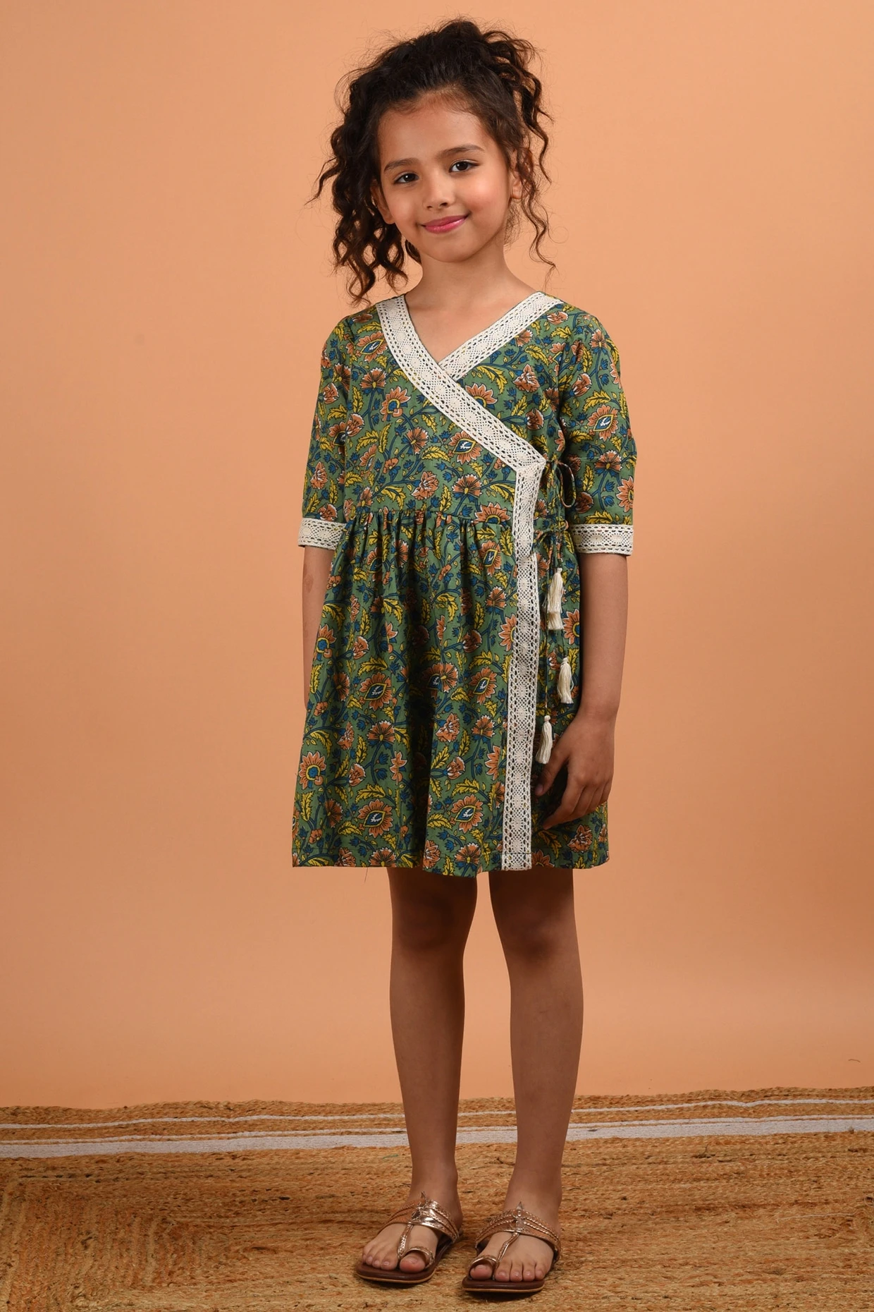 Featuring a green dress in cotton base with floral print and crochet lace work.