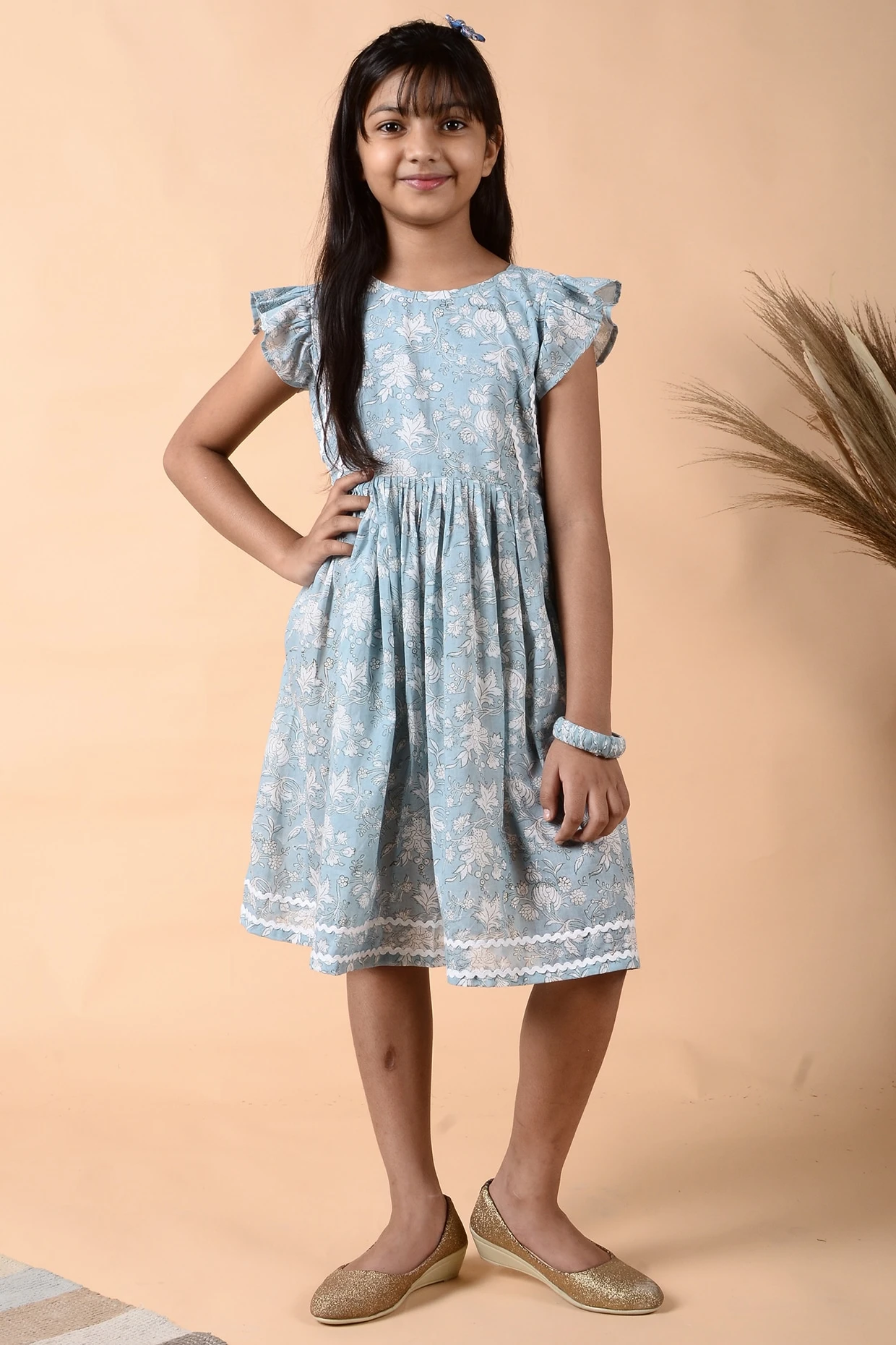 Featuring an ice grey dress in cotton base with frilled sleeves, bow tie-up, crochet lace embroidery, and floral print.