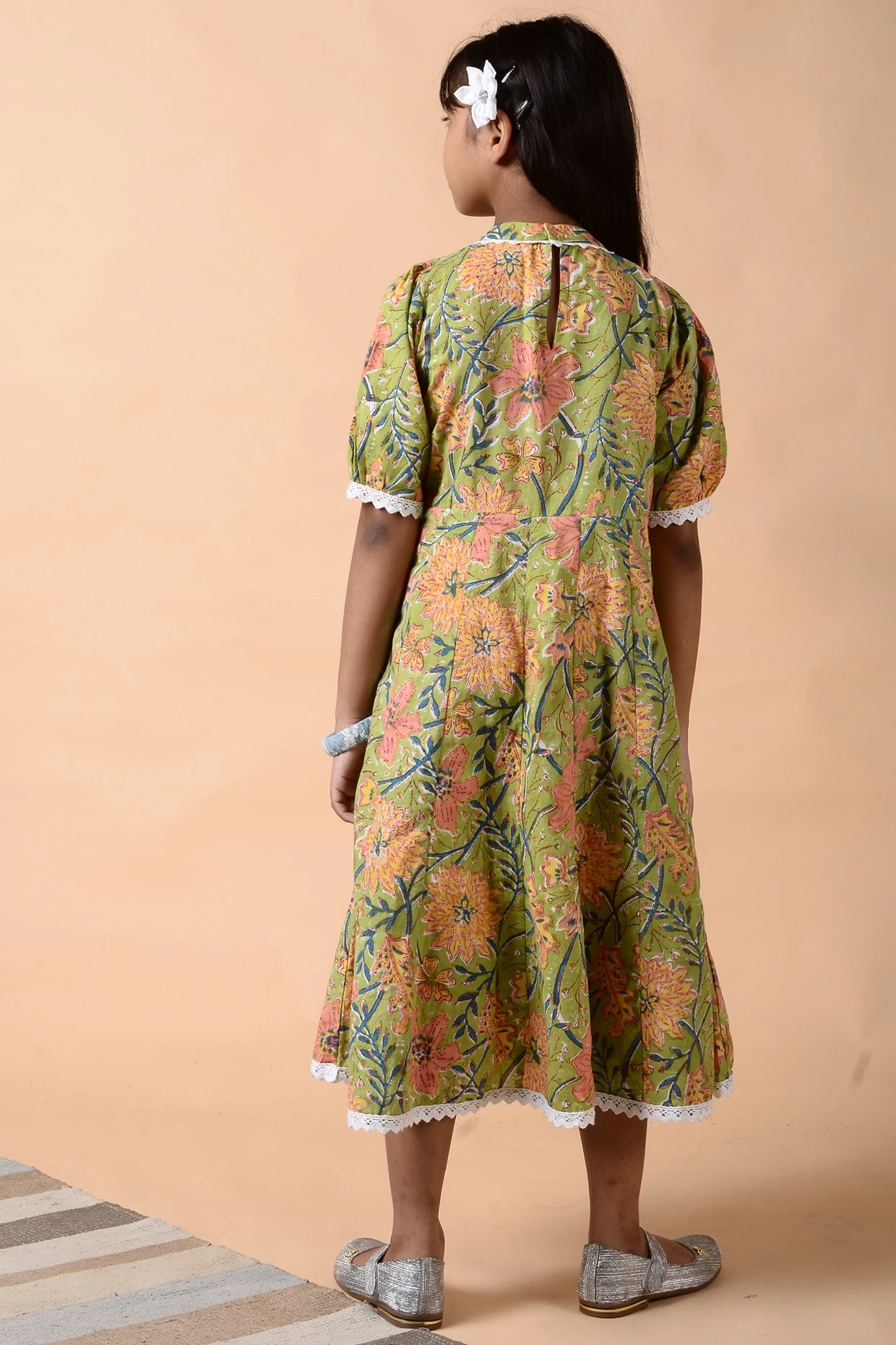 Featuring a leaf green kalidar dress in cotton base with gathered sleeves, crochet lace embroidery, and floral print.