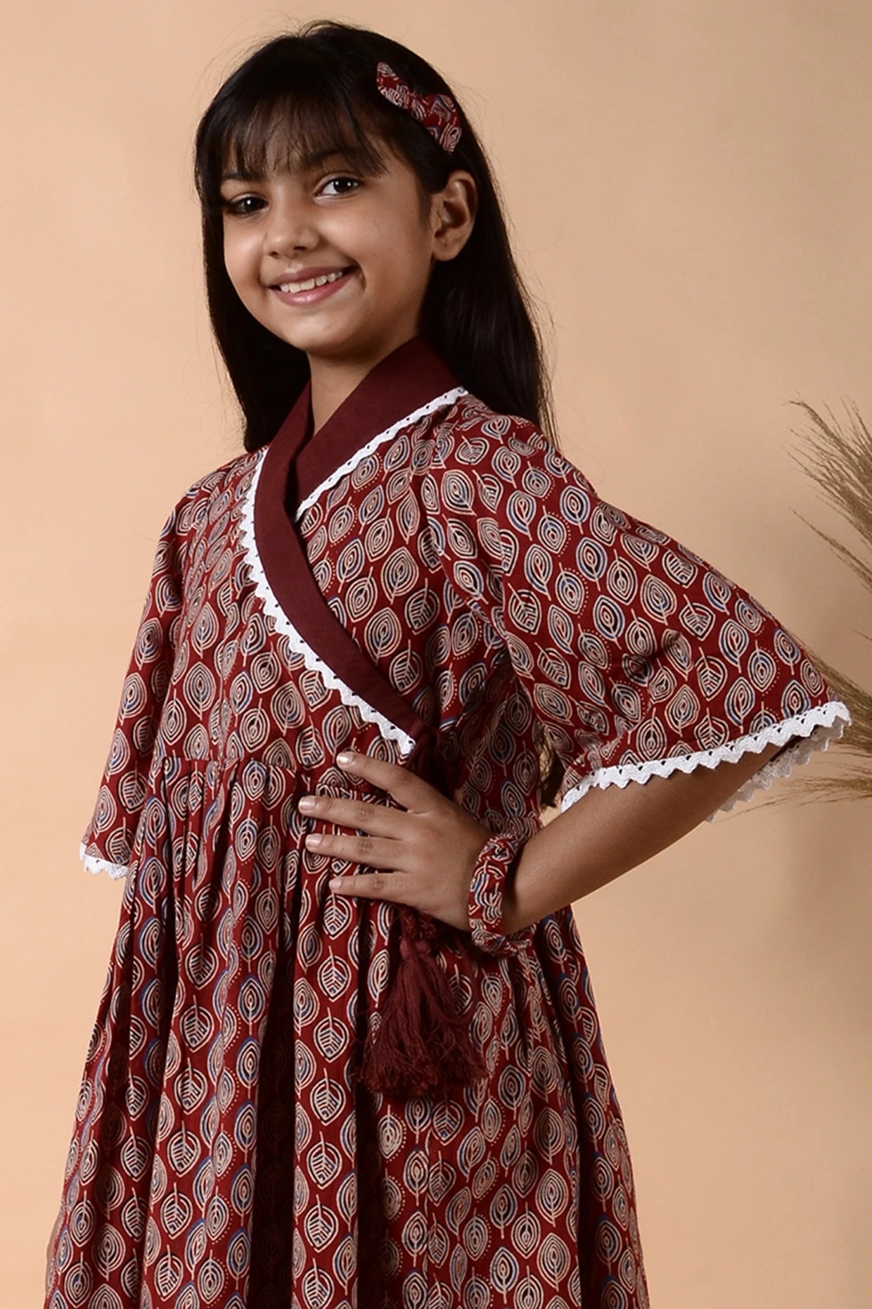 Featuring a maroon dress in cotton base with a side tie-up, handmade tassels, floral print, and crochet lace embroidered neckline.