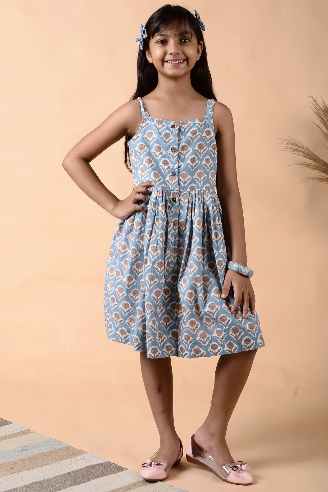 Featuring a stone blue cami dress in cotton base with a front opening having wooden buttons, floral print, and knife pleats.