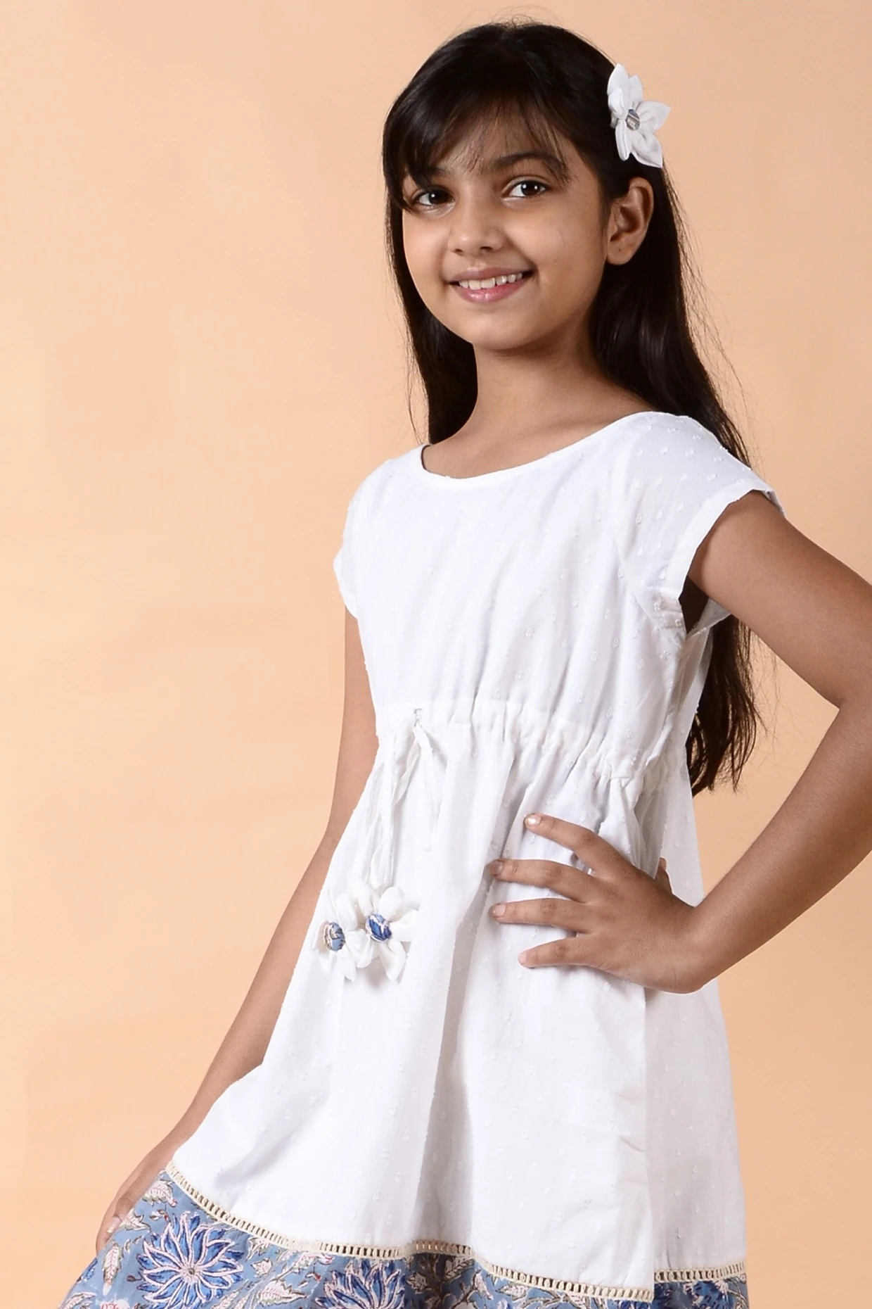 Featuring a white dress in cotton base with a string tie-up, handmade floral tassels, crochet lace embroidery, and block print.