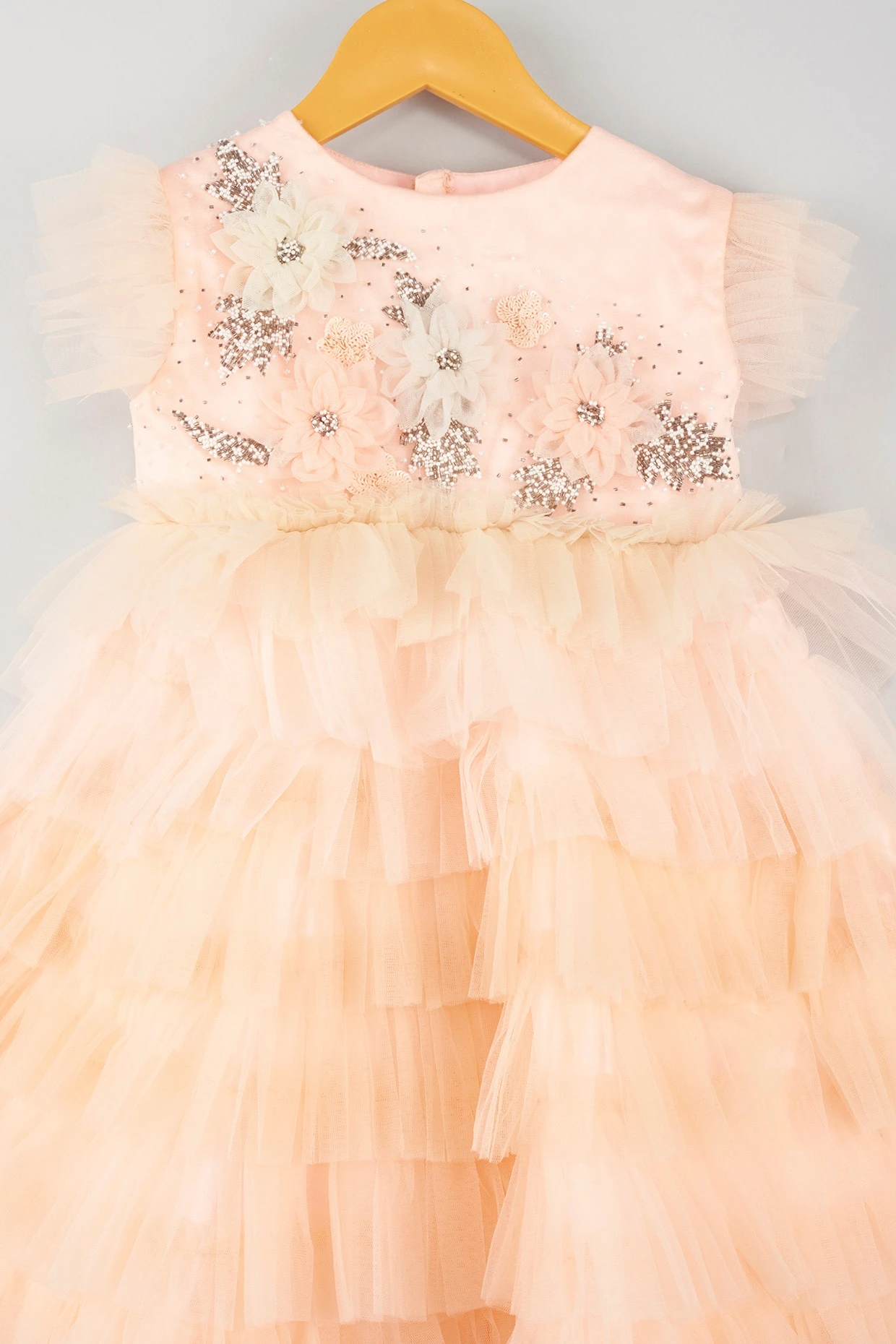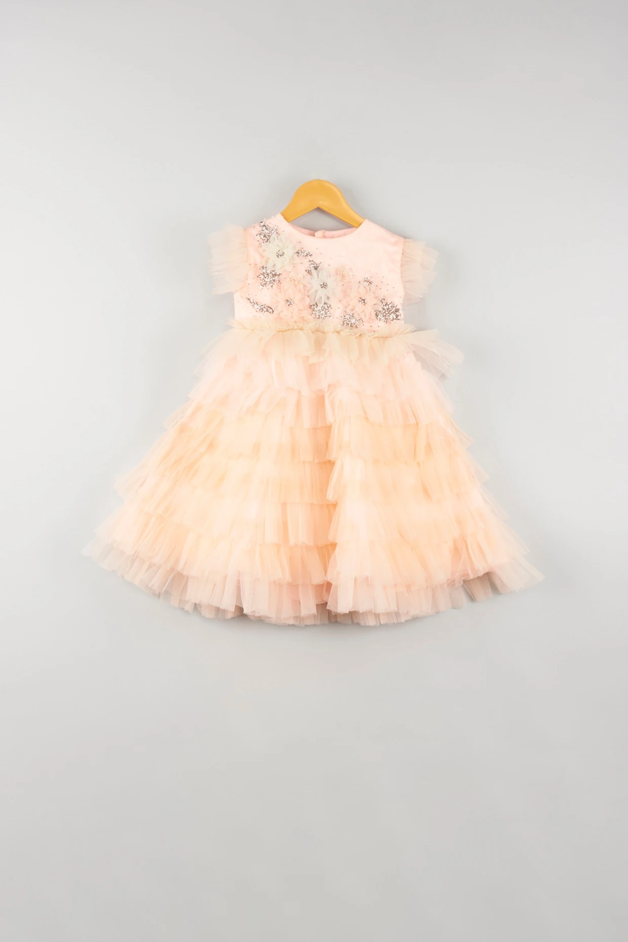 Featuring a peach layered dress in net base with floral hand embroidery.