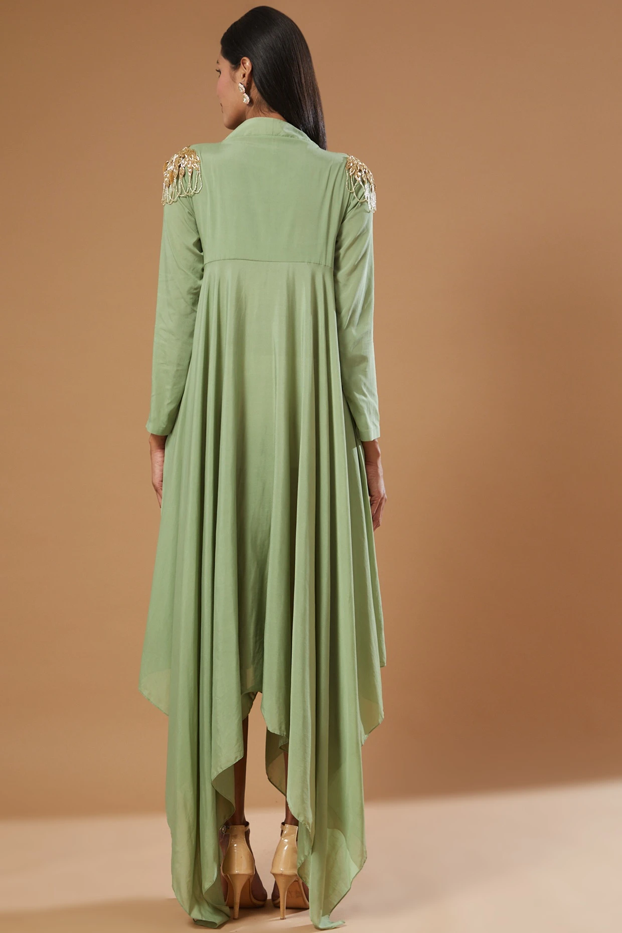 Featuring an olive green draped dress in crepe base with shoulder patches.