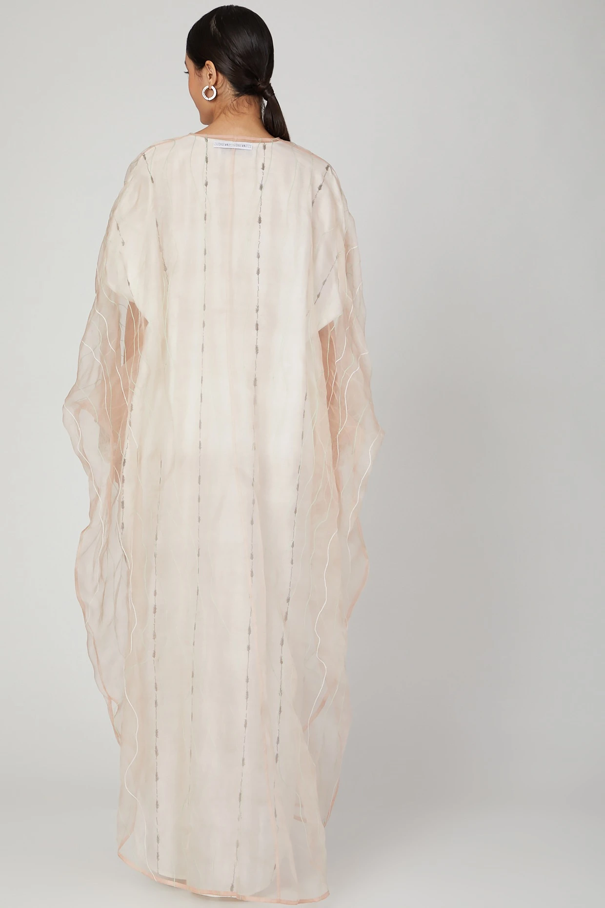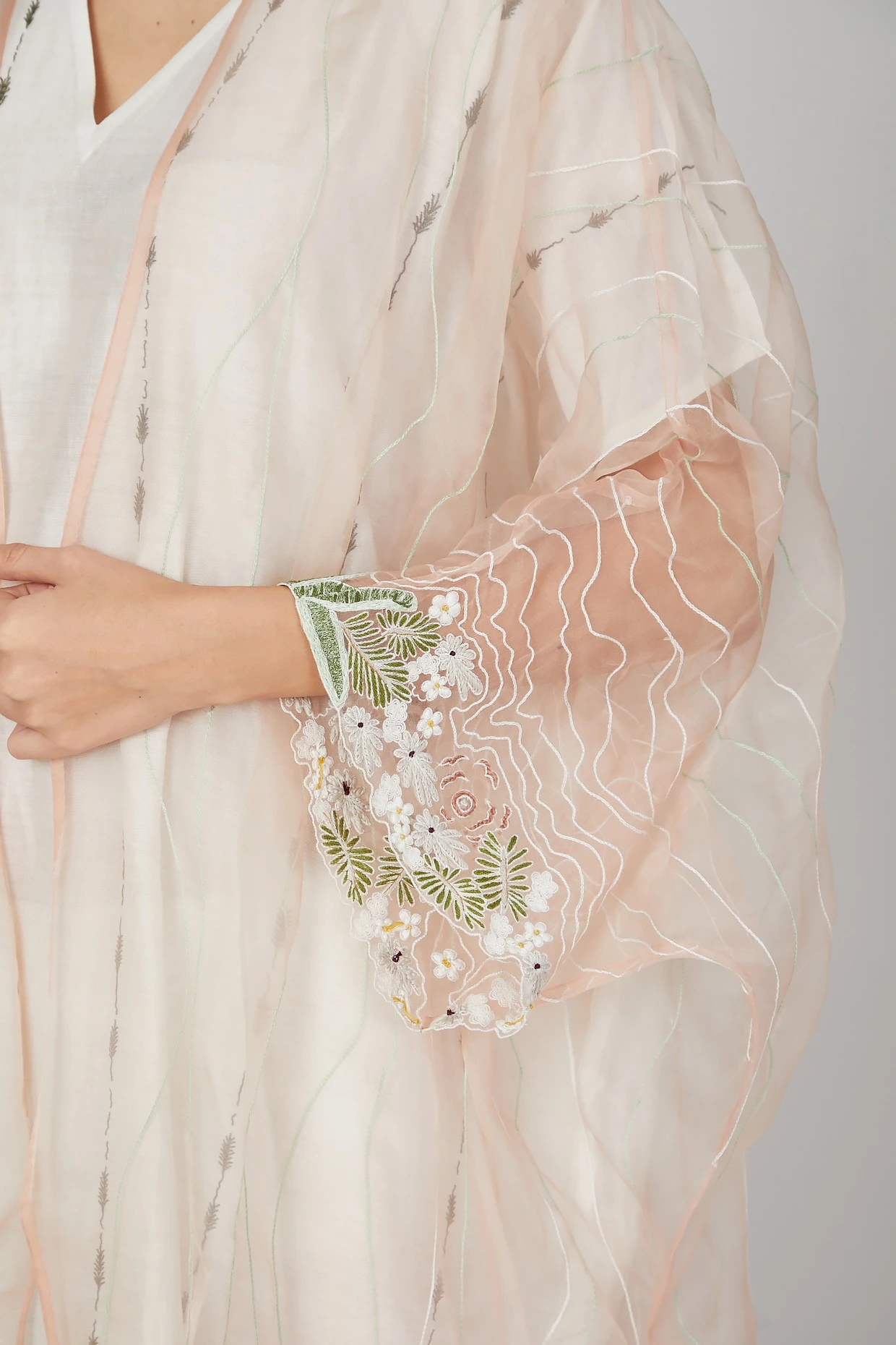 Featuring a white kaftan in silk organza base with handcrafted embroidery. It is paired with a matching silk chanderi embroidered dress.